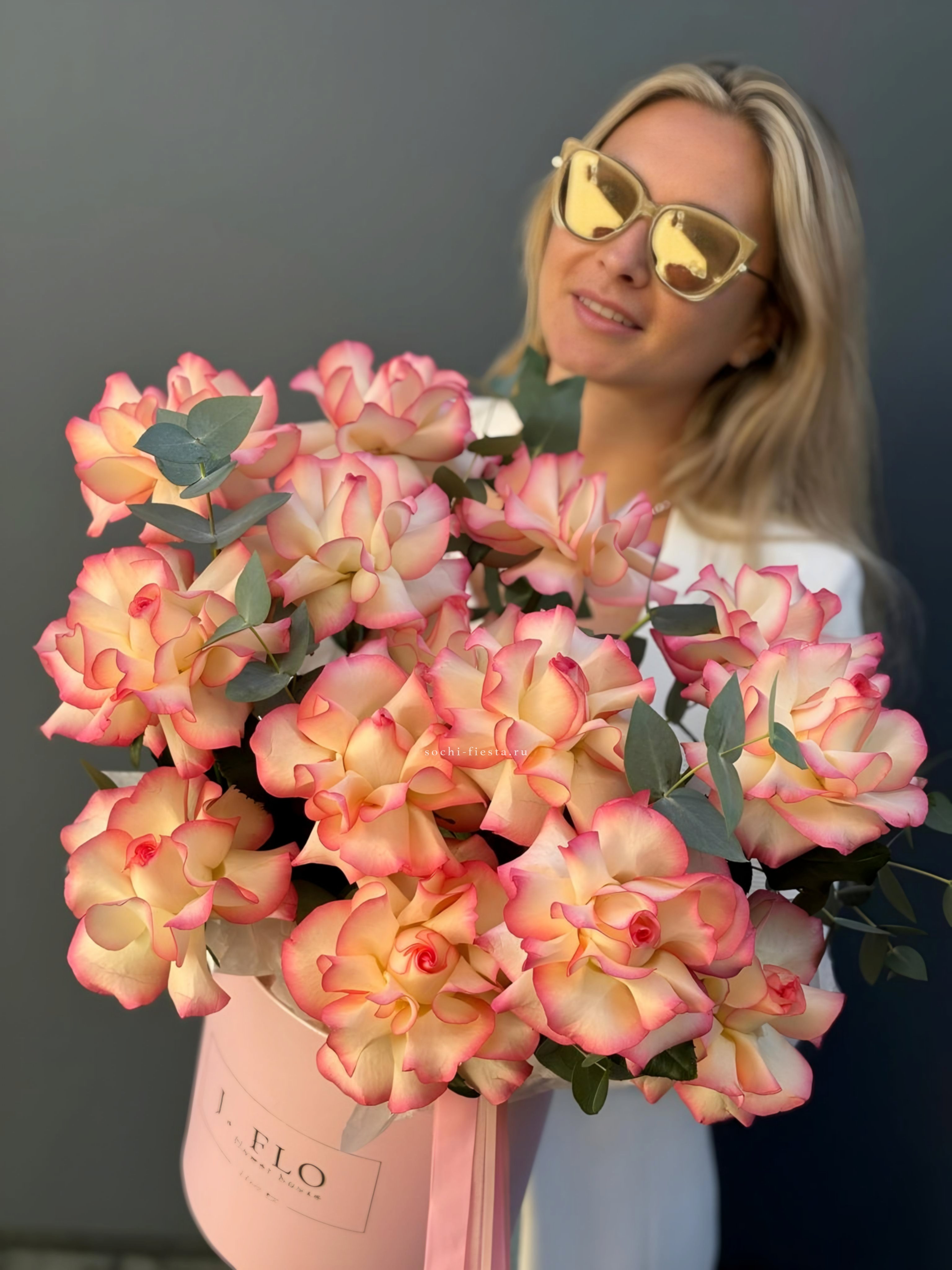 Пятнадцать вывернутых роз Джумилия раскрывают свою многослойную структуру в каждом бутоне. Эвкалипт обрамляет композицию, подчёркивая фактуру лепестков.