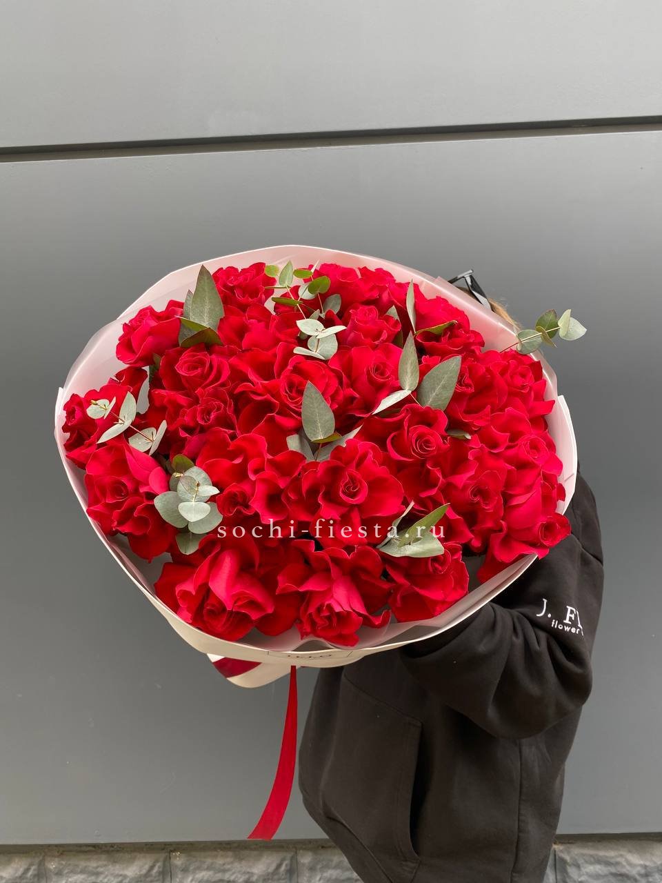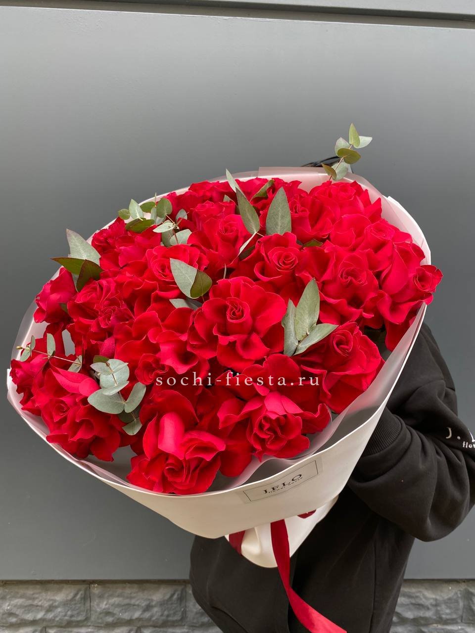 вывернутые красные розы, цилиндр D16, эвкалипт, лента, упаковка.