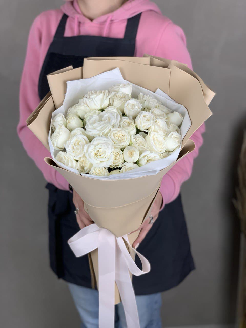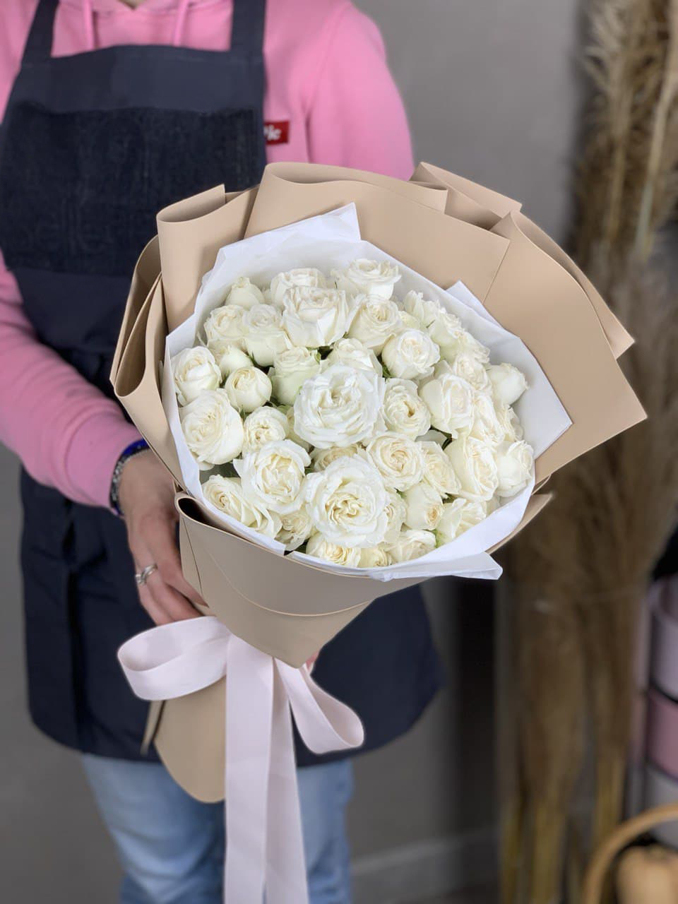 Тридцать пять белых роз образуют объемную композицию с выразительным силуэтом. Светлая упаковка поддерживает воздушность и графичность линий.