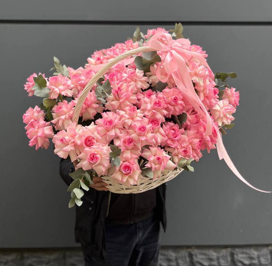 То самое «облако» нежности, о котором мечтает каждая! Эта огромная корзина французских роз поражает своим объемом и воздушностью. Специальная техника выворачивания лепестков превращает каждый бутон в пышное совершенство. Это не просто подарок, а масштабный жест любви и обожания, который точно запомнится надолго.