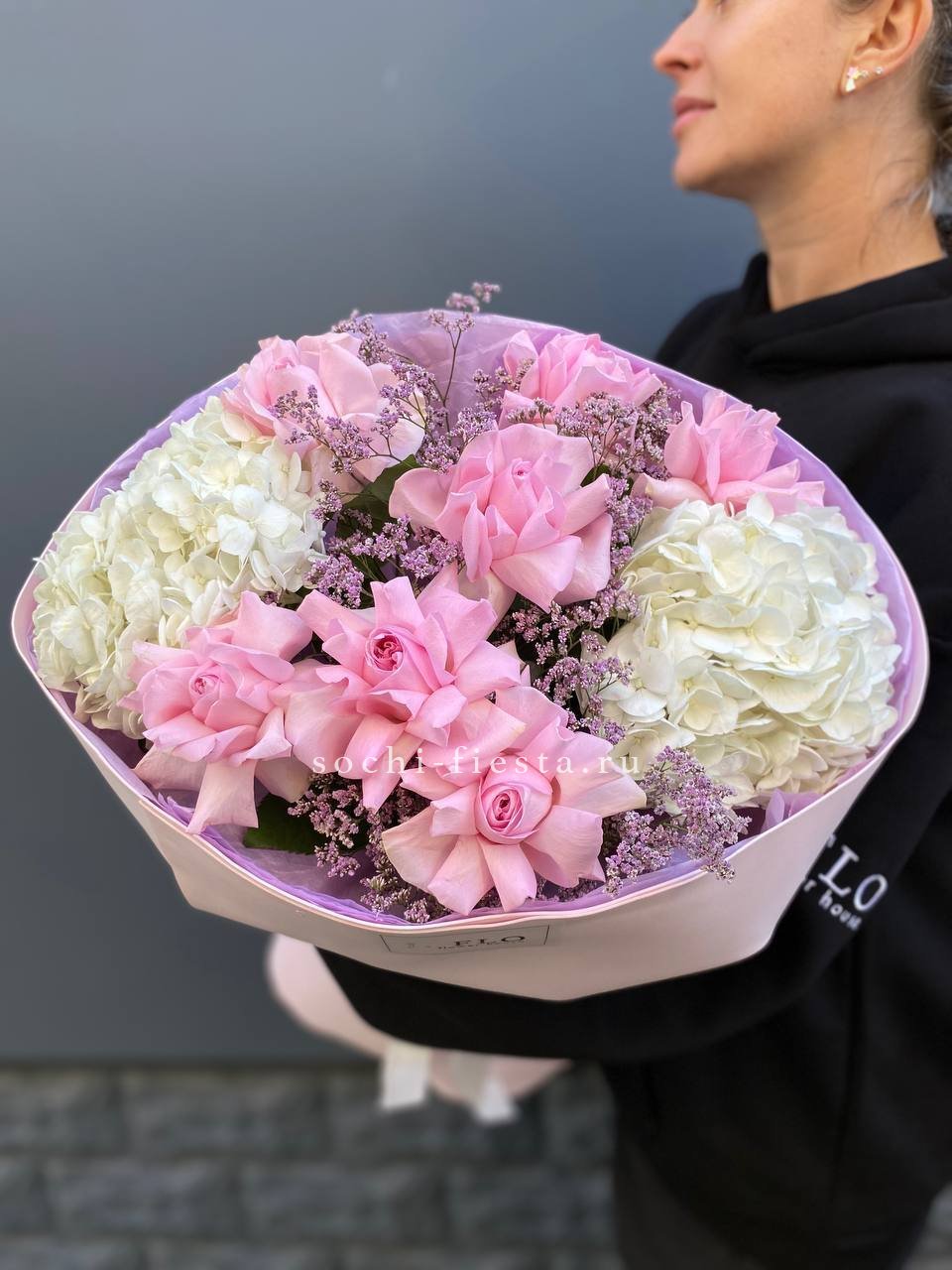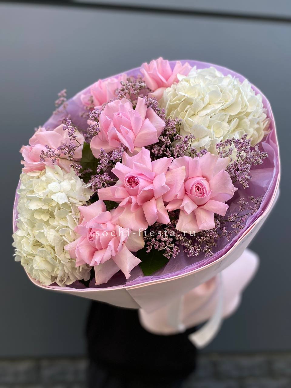 Букет с вывернутыми розами и пушистыми шапками гортензии создает легкое французское настроение. Лимониум вплетается тонкими ветвями, добавляя воздуха между бутонами.