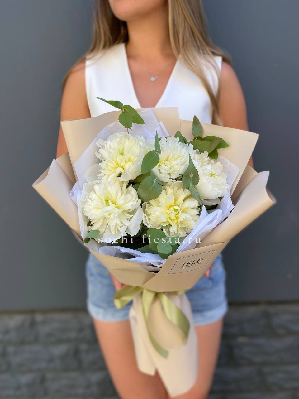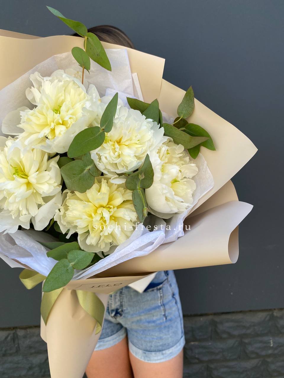 Белые пионы с серебристым эвкалиптом собраны в лаконичный букет. Прозрачная упаковка сохраняет свежесть и подчёркивает естественную красоту бутонов.