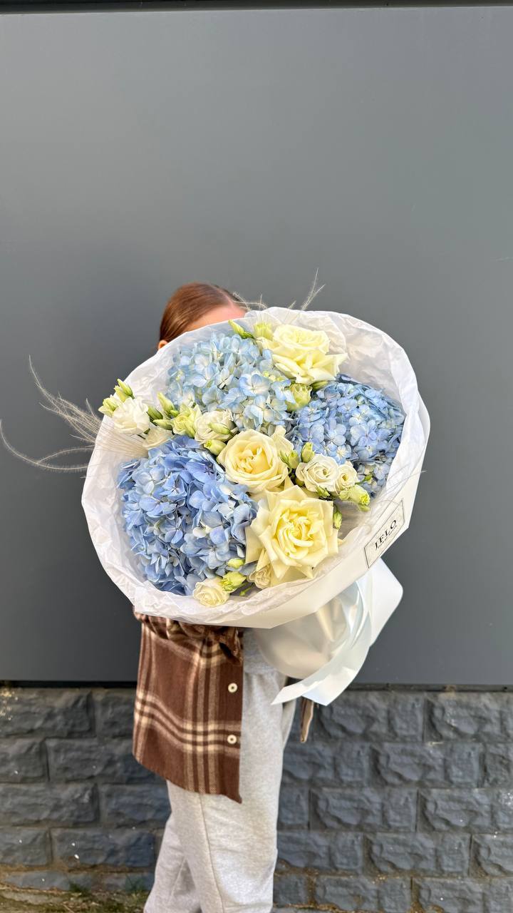 Сочетание пышной голубой гортензии и классических белых роз — это гимн нежности и чистоты. Букет, который не просто удивляет своим масштабом, но и дарит ощущение безмятежности. Идеальный выбор для самого искреннего признания.