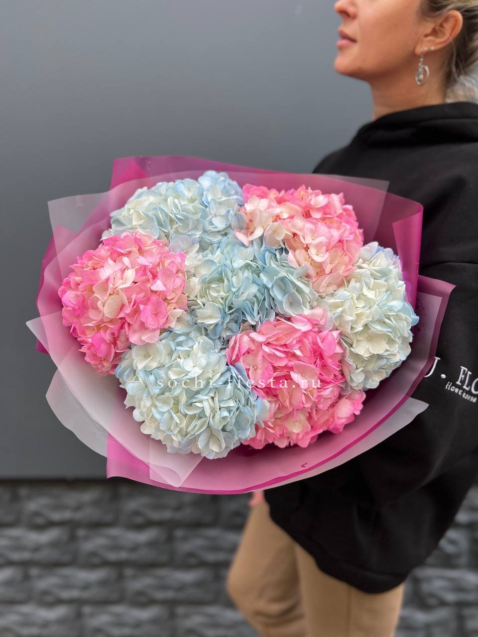 Семь соцветий гортензии раскрываются воздушным облаком с мягкими переходами оттенков. Букет дарит ощущение лёгкости и свежести летнего сада в любое время года.