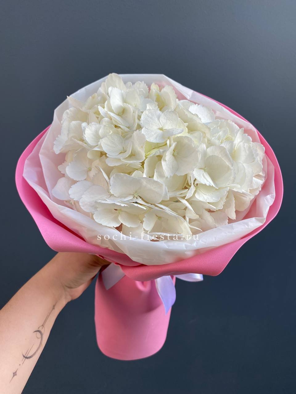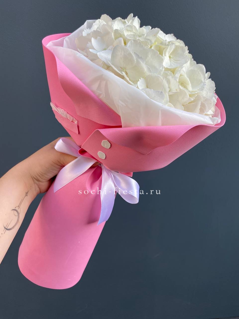 гортензия, белые розы, гипсофилы (или мимоза), эустомы, герберы, хлопок, лента и дизайнерская пленка.