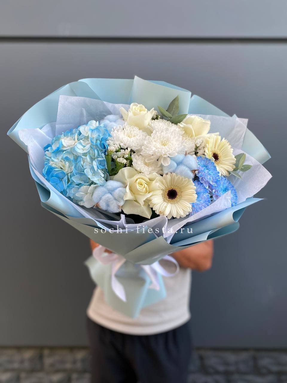 гортензия, хризантема, белая роза, гербера, статица, хлопок, упаковка.
