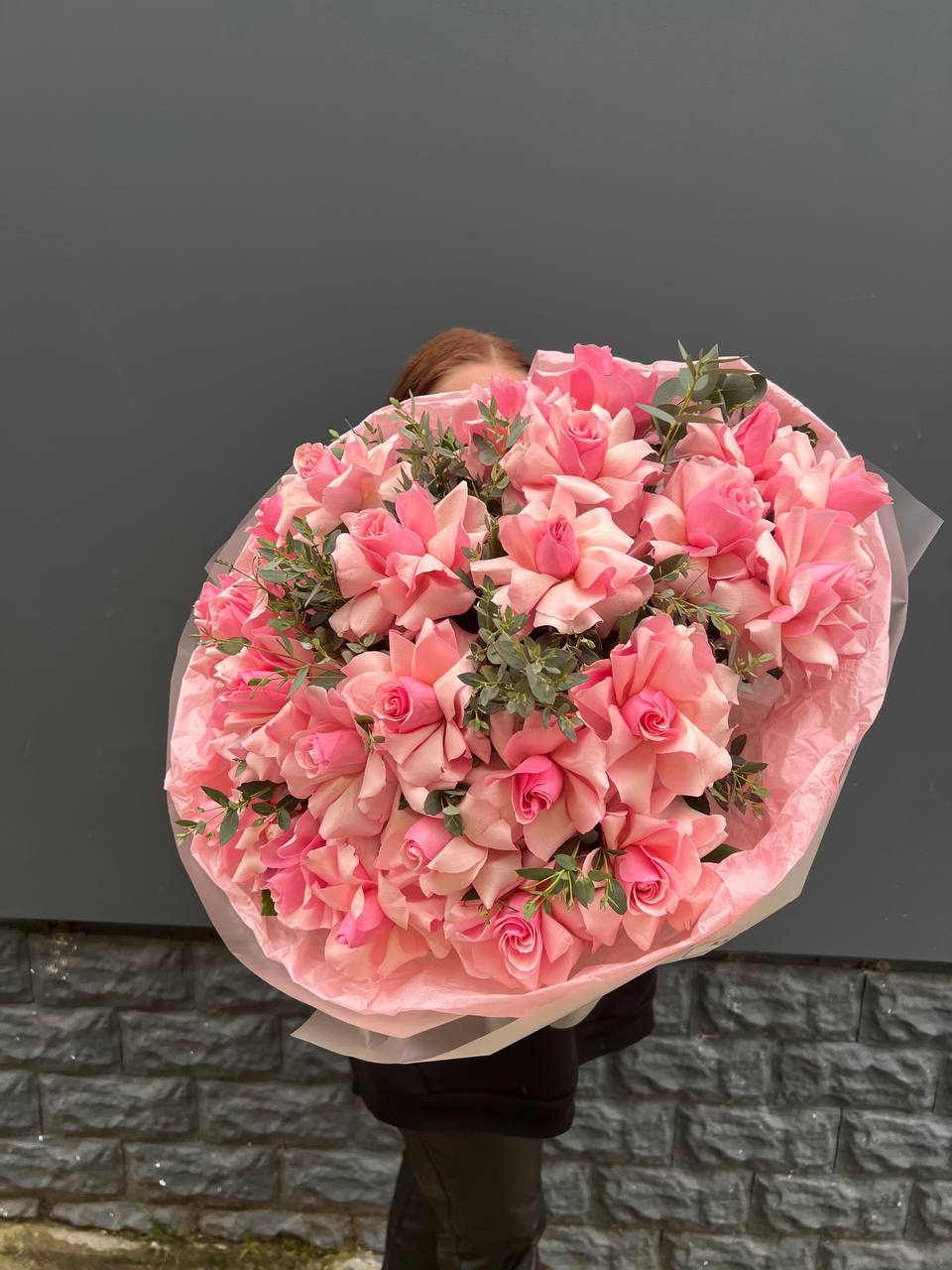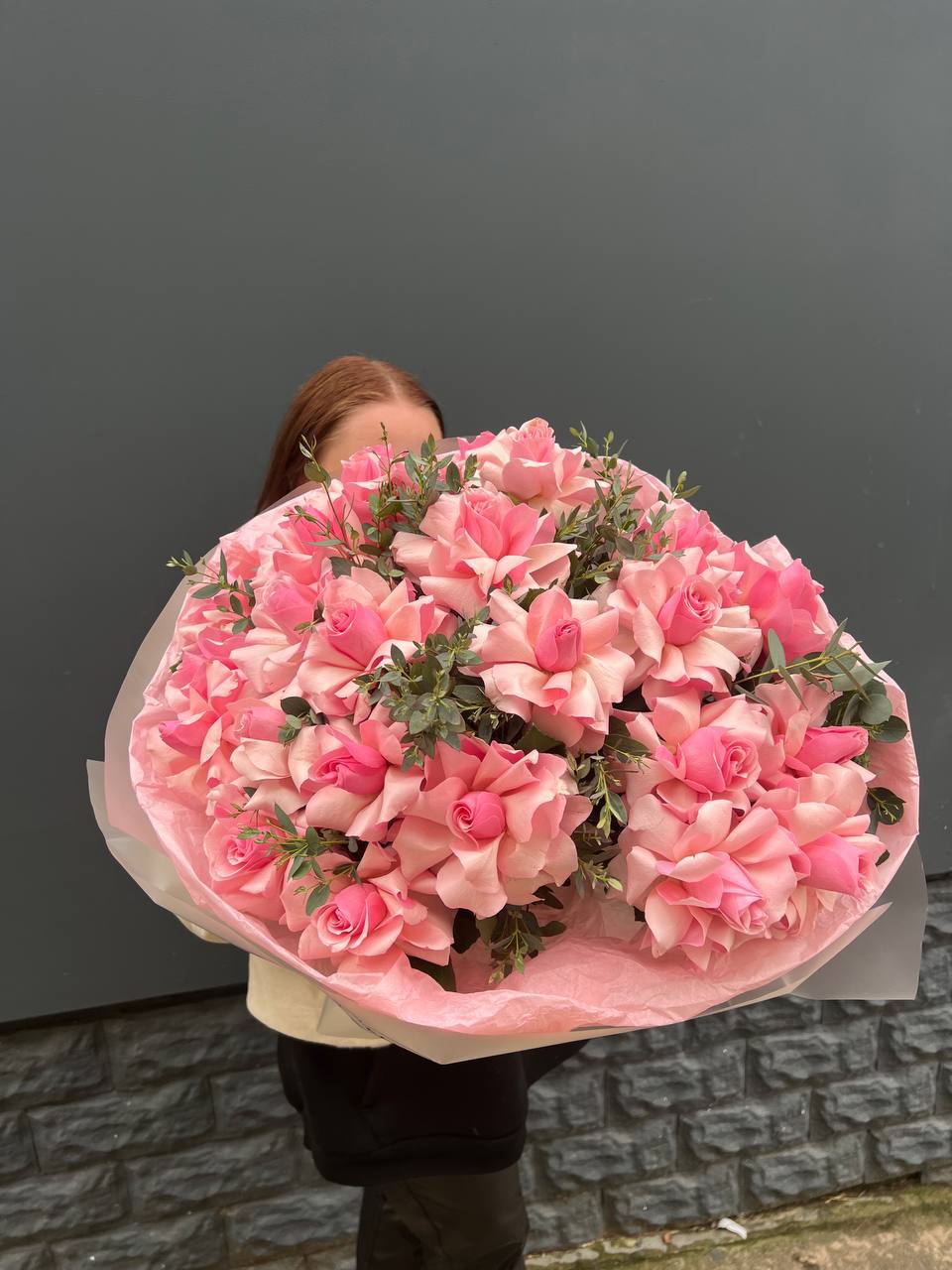 Сорт Lolita отличается насыщенным цветом и крупными бутонами с бархатистой текстурой лепестков. Пятьдесят пять стеблей формируют внушительную композицию с выраженным объемом. Букет выглядит как самостоятельный арт-объект.