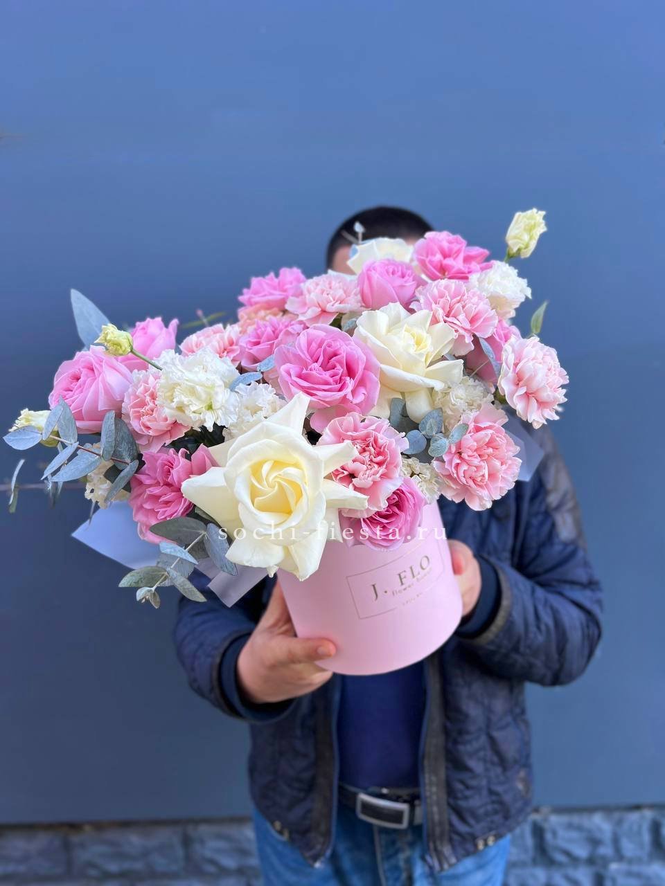 Белые и розовые розы переплетаются с эустомой и диантусом в круглом цилиндре. Эвкалипт добавляет объём и свежесть композиции. Сочная палитра для яркого поздравления.