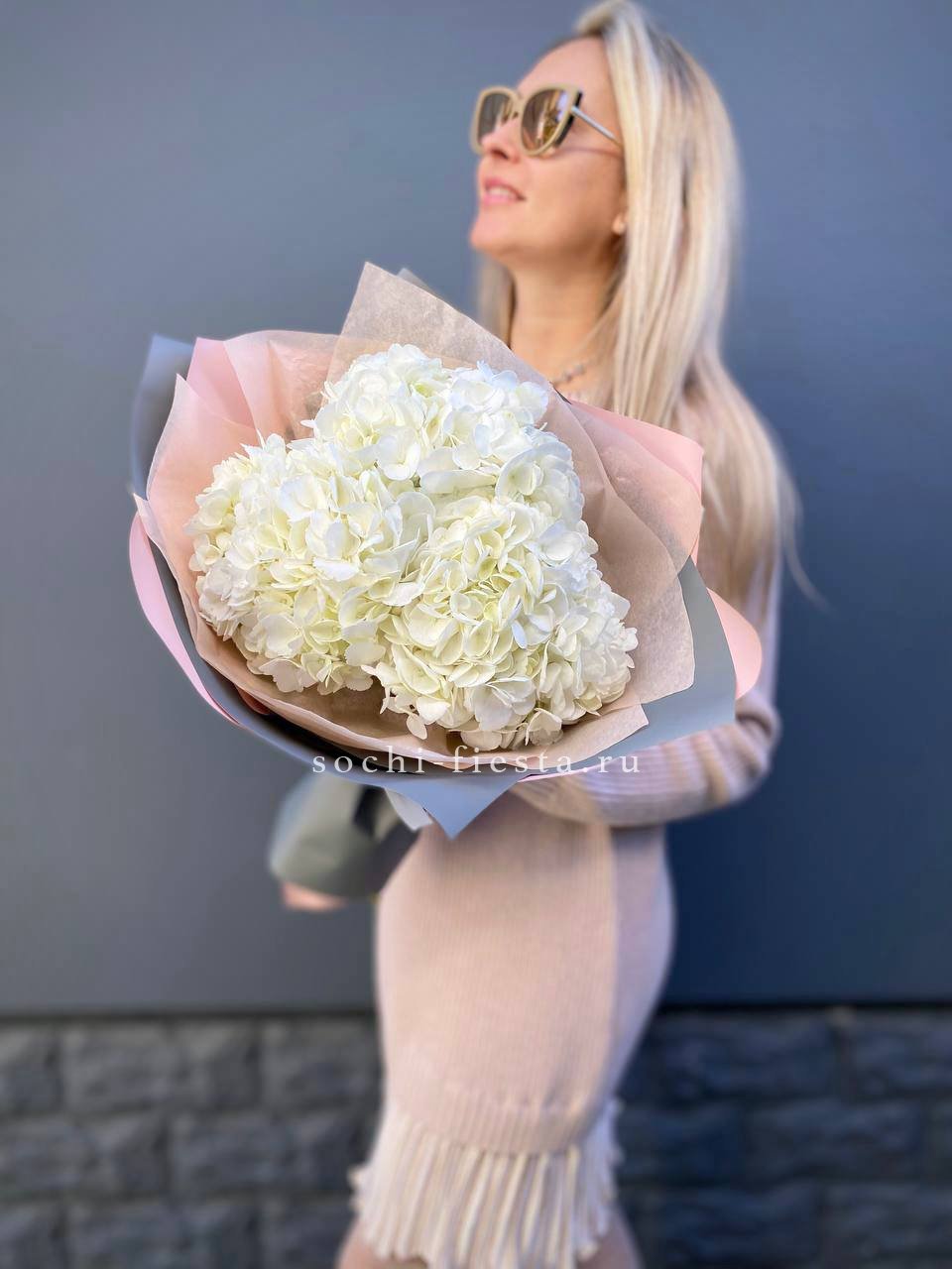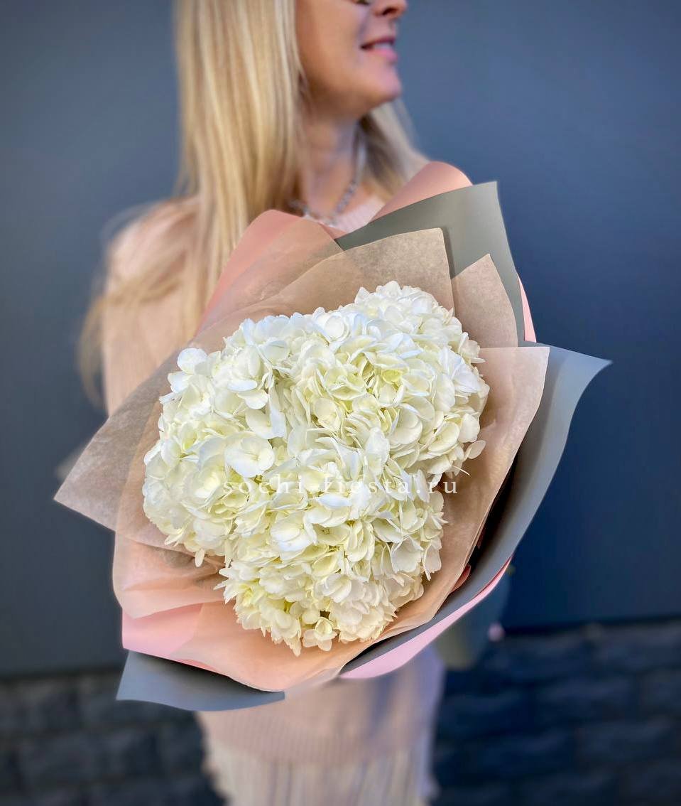 Белоснежное соцветие гортензии с плотной структурой и чистым тоном. Универсальный вариант для минималистичных интерьеров и спокойных решений.