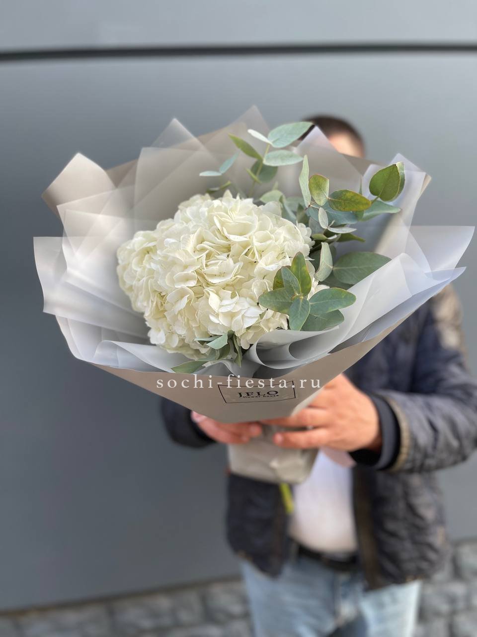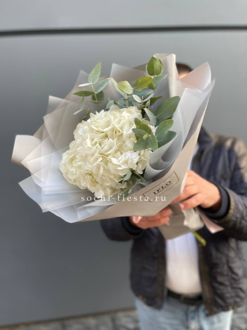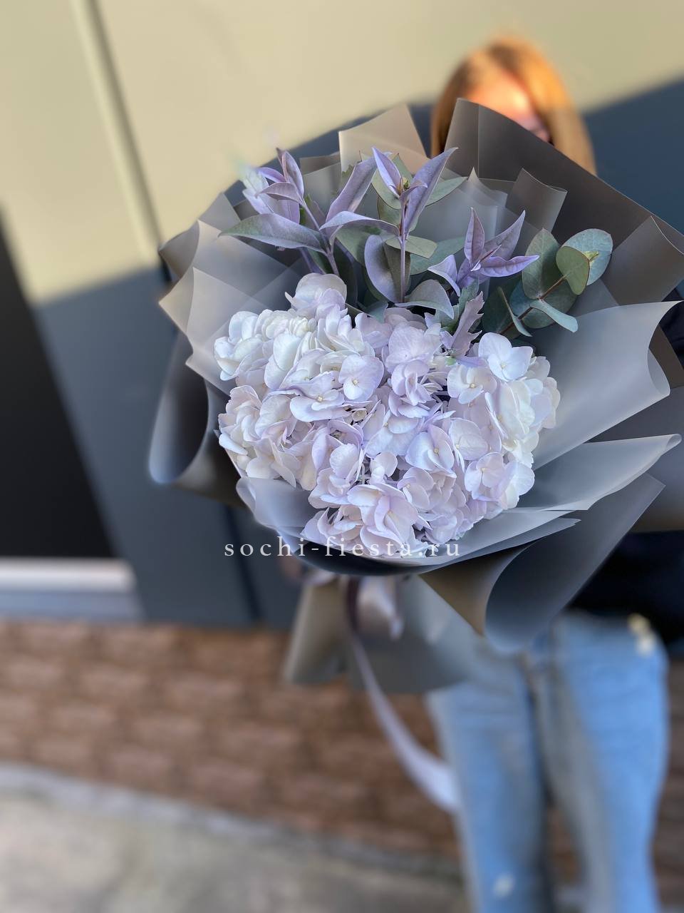 гортензия, эвкалипт, лента, дизайнерская упаковка.