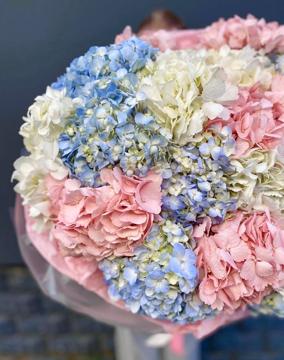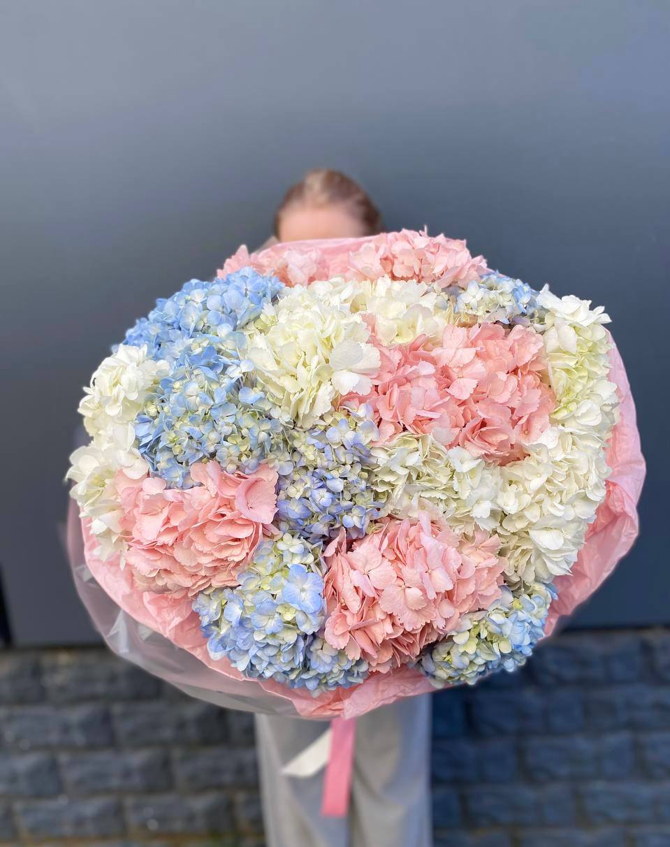 Воздушные шапки соцветий собраны в пышную охапку белоснежного цвета. Гортензия создаёт объёмную текстуру и заполняет пространство мягким природным светом. Букет для тех, кто ценит чистоту линий и естественную красоту.