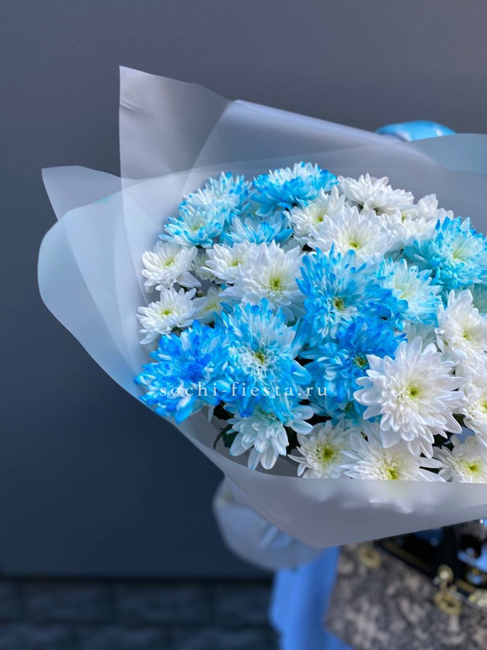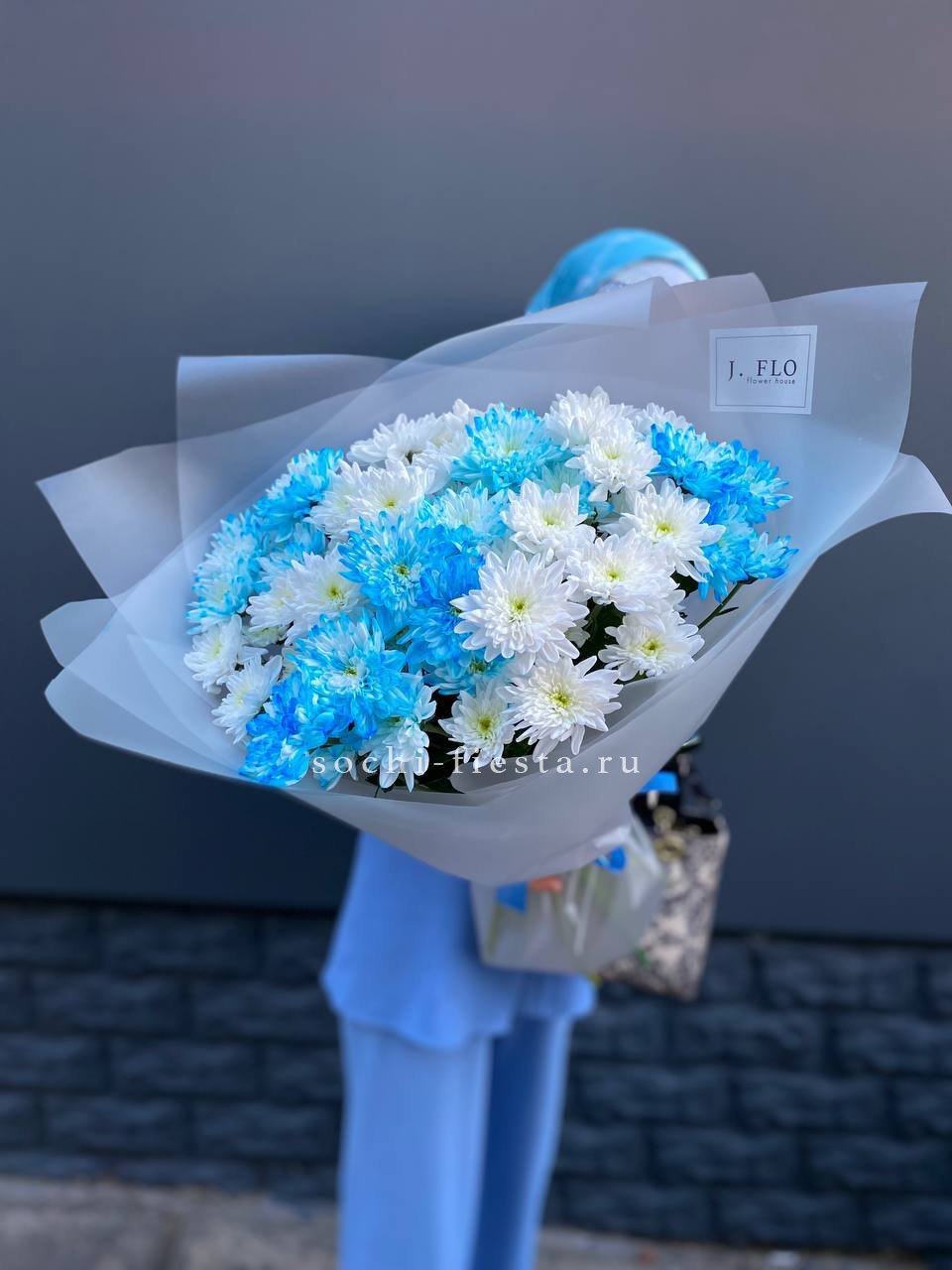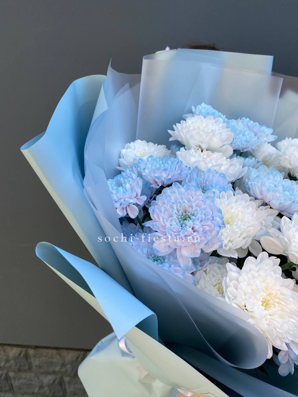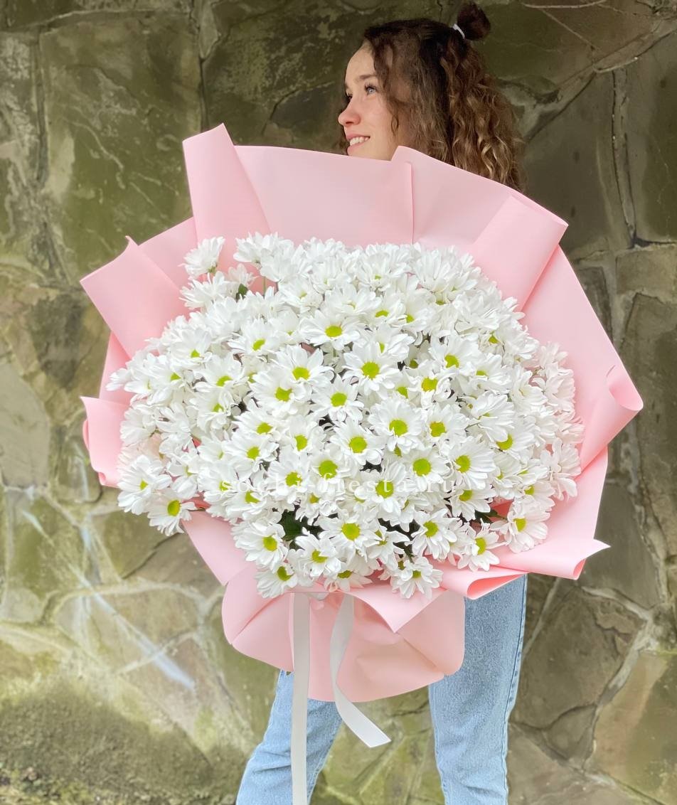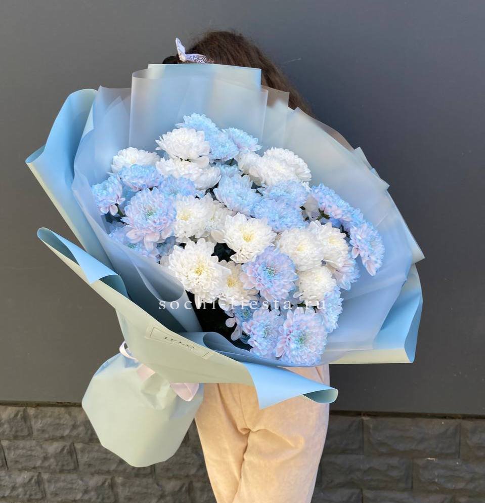 Девять пышных хризантем с переходом от сиреневого к белому собраны в аккуратную композицию. Лавандовая упаковка дополняет холодную гамму и создаёт цельное впечатление. Букет хорошо держит форму и подходит для размещения в высокой вазе.
