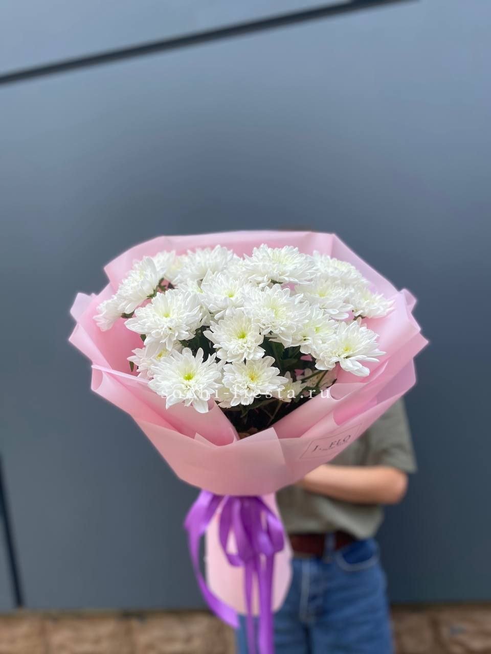 минимальный состав: 11 одноголовых хризантем, лента, упаковка на выбор.