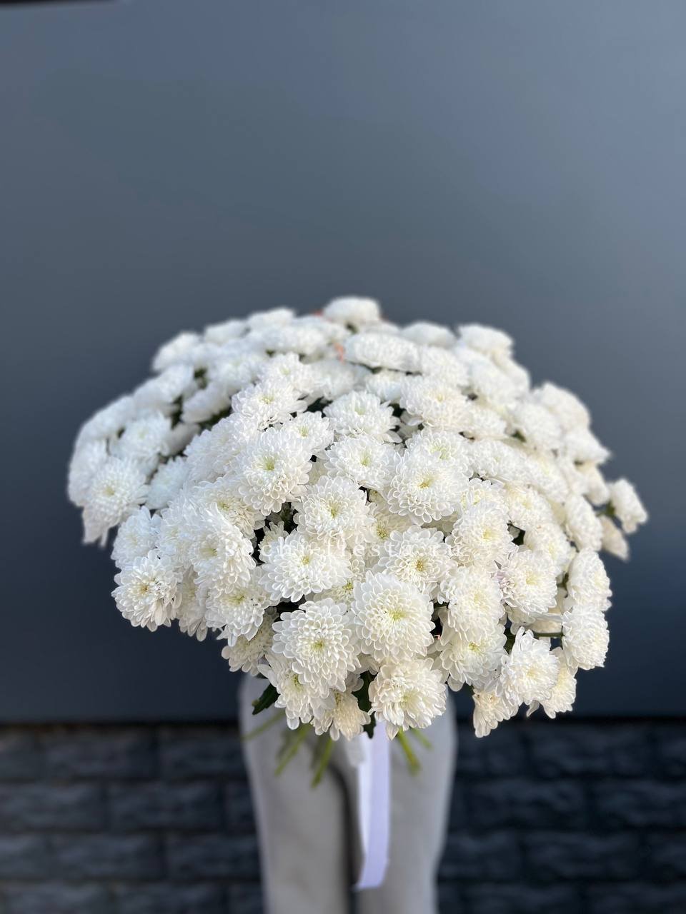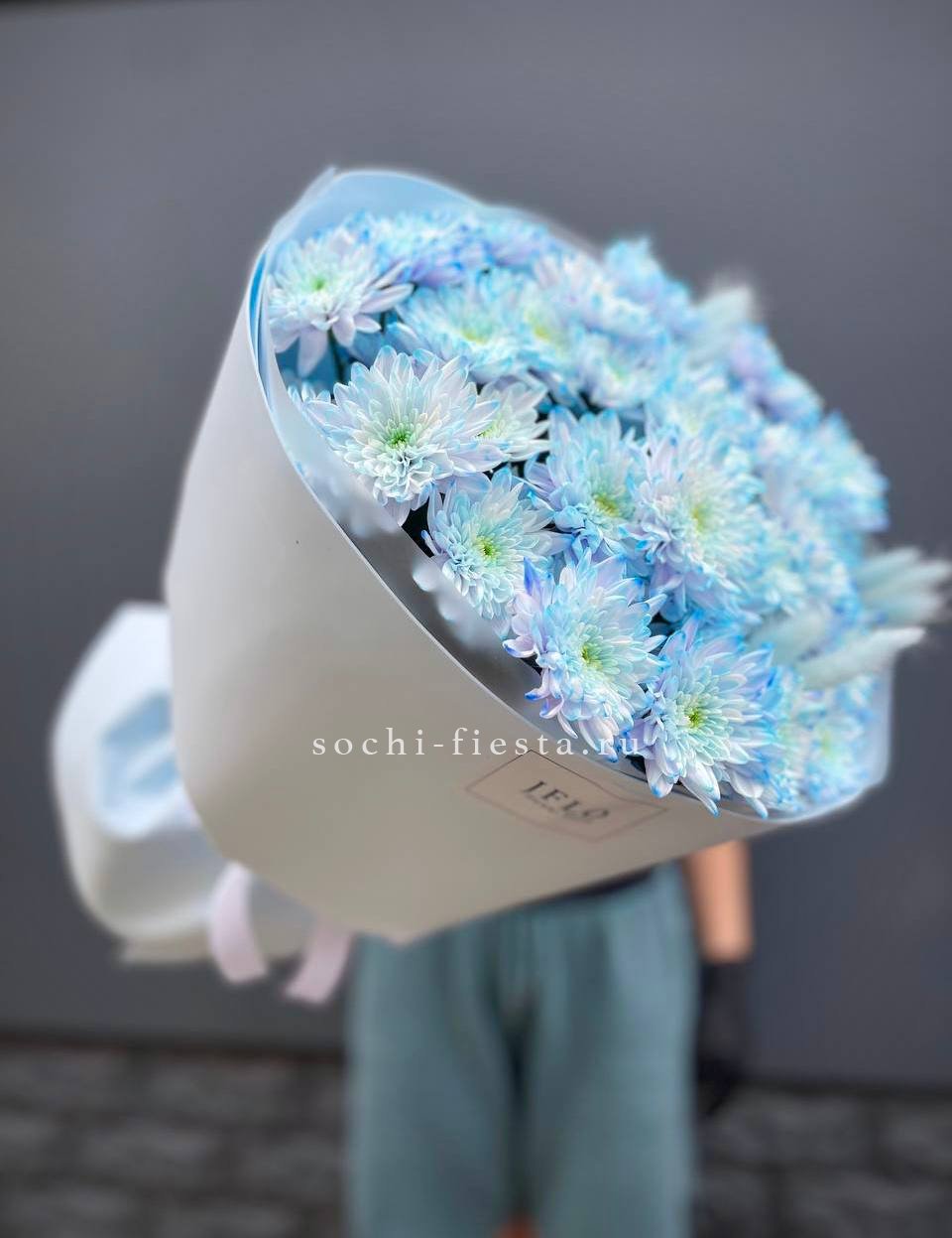 Девять веток кустовой хризантемы в пастельном голубом тоне дополнены пушистым лагурусом. Мягкая цветовая гамма и воздушная текстура создают спокойное визуальное впечатление.