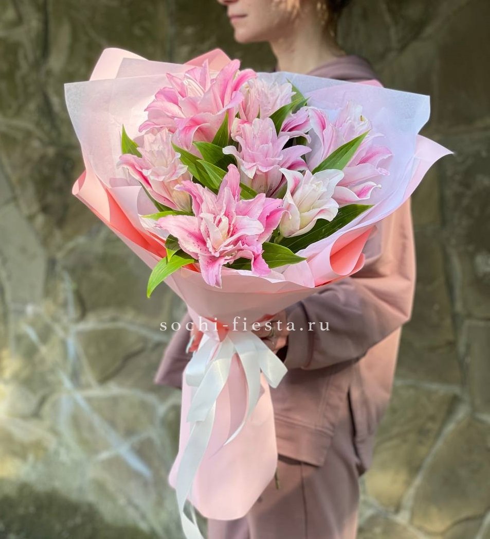 Пионовидные лилии раскрываются многослойными бутонами с густыми лепестками. Семь соцветий образуют пышную форму с выраженной фактурой и глубиной. Композиция впечатляет визуальной насыщенностью и природной красотой.