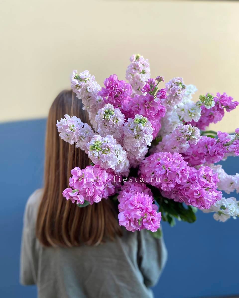 Плотные соцветия маттиолы собраны в пышную охапку с живым объёмом. Её аромат заполняет комнату уже через несколько минут после появления в доме.