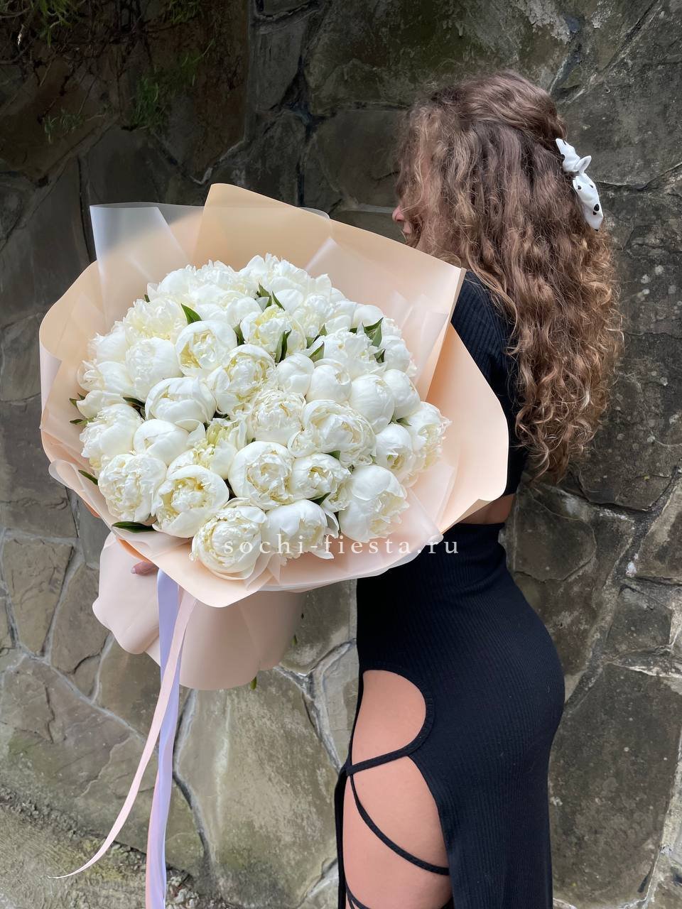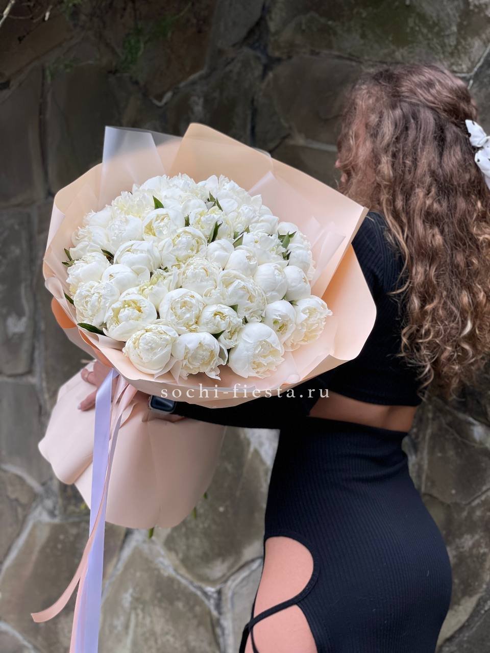 белый пион, лента, упаковка на выбор.