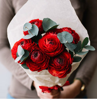 Девять красных ранункулюсов собраны в яркую композицию с зеленью эвкалипта. Глубокий оттенок бутонов притягивает взгляд и наполняет пространство энергией.