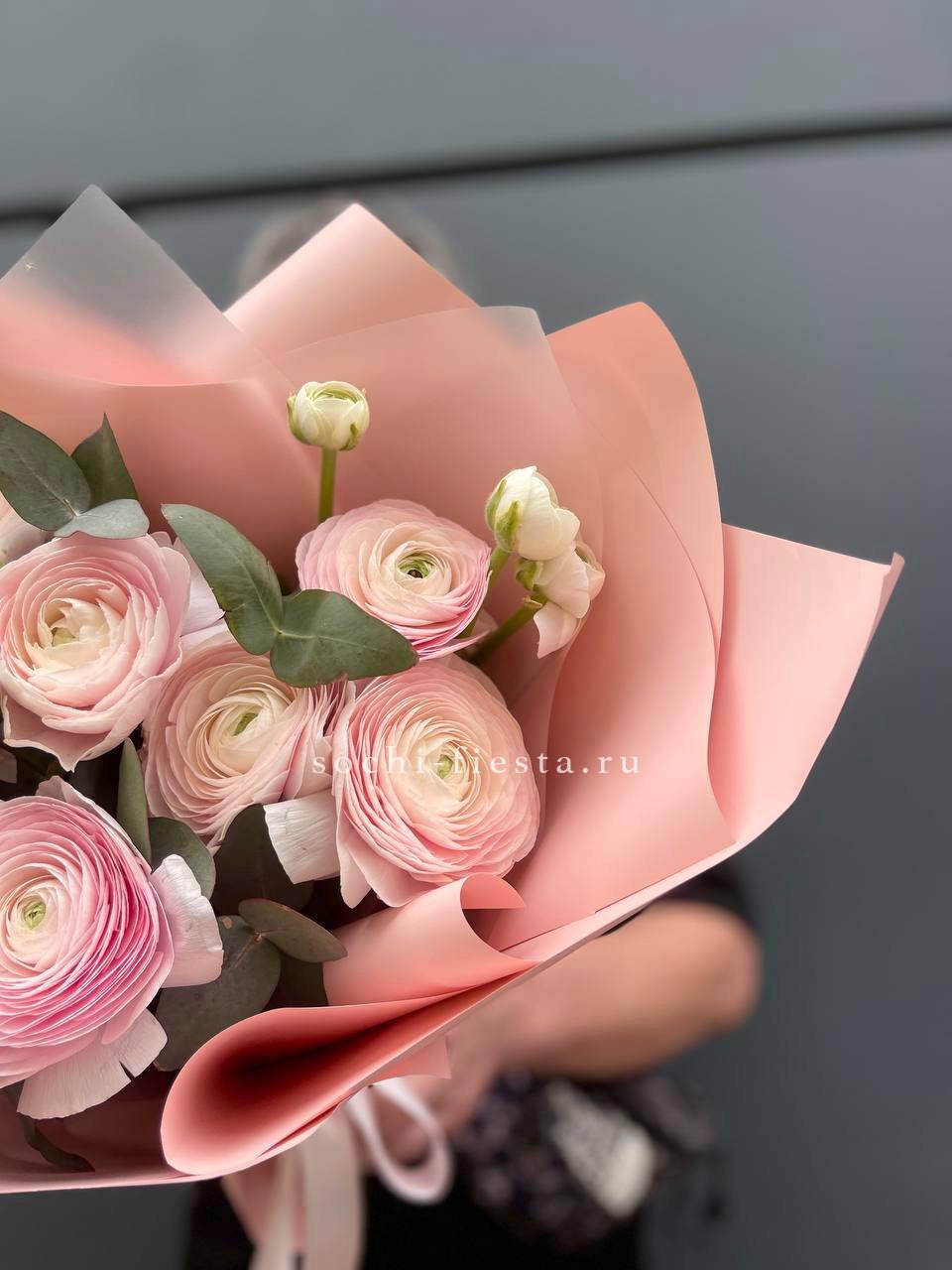 Семь ранункулюсов образуют компактный букет с мягкими переходами оттенков. Эвкалипт добавляет объём и создаёт лёгкую текстуру вокруг бутонов.