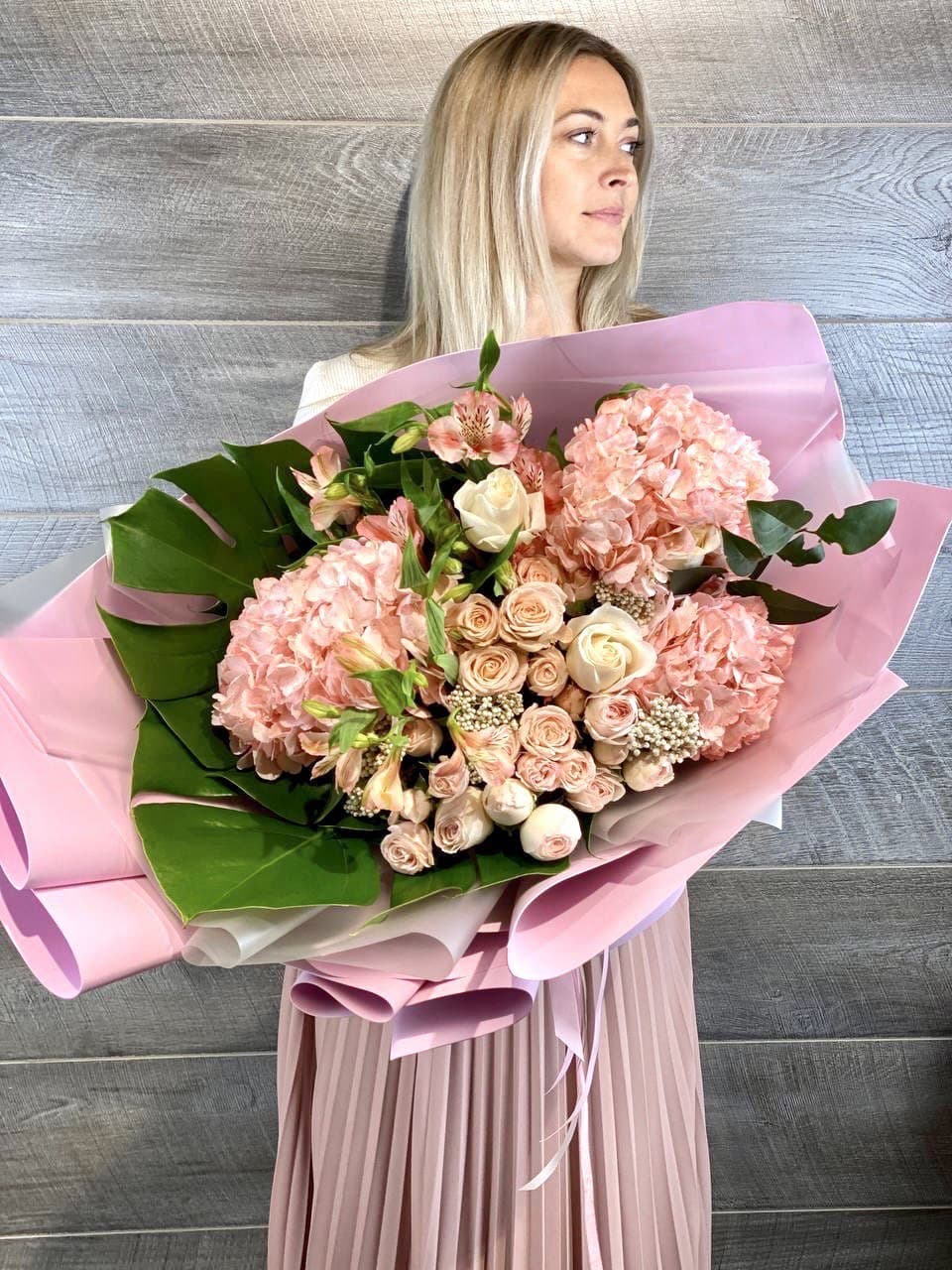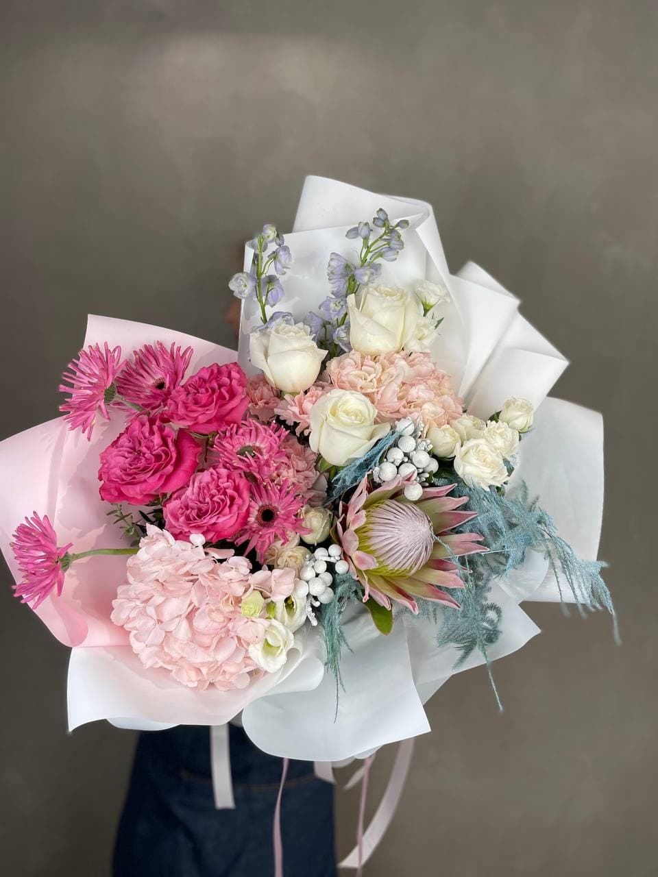 Пышные шапки гортензии переплетаются с бархатными бутонами пионовидных роз, создавая объёмную композицию насыщенного розового оттенка. Орхидеи и эустома добавляют воздушности, а диантус расставляет яркие точки. Букет заполняет пространство и притягивает взгляд своей плотной структурой.