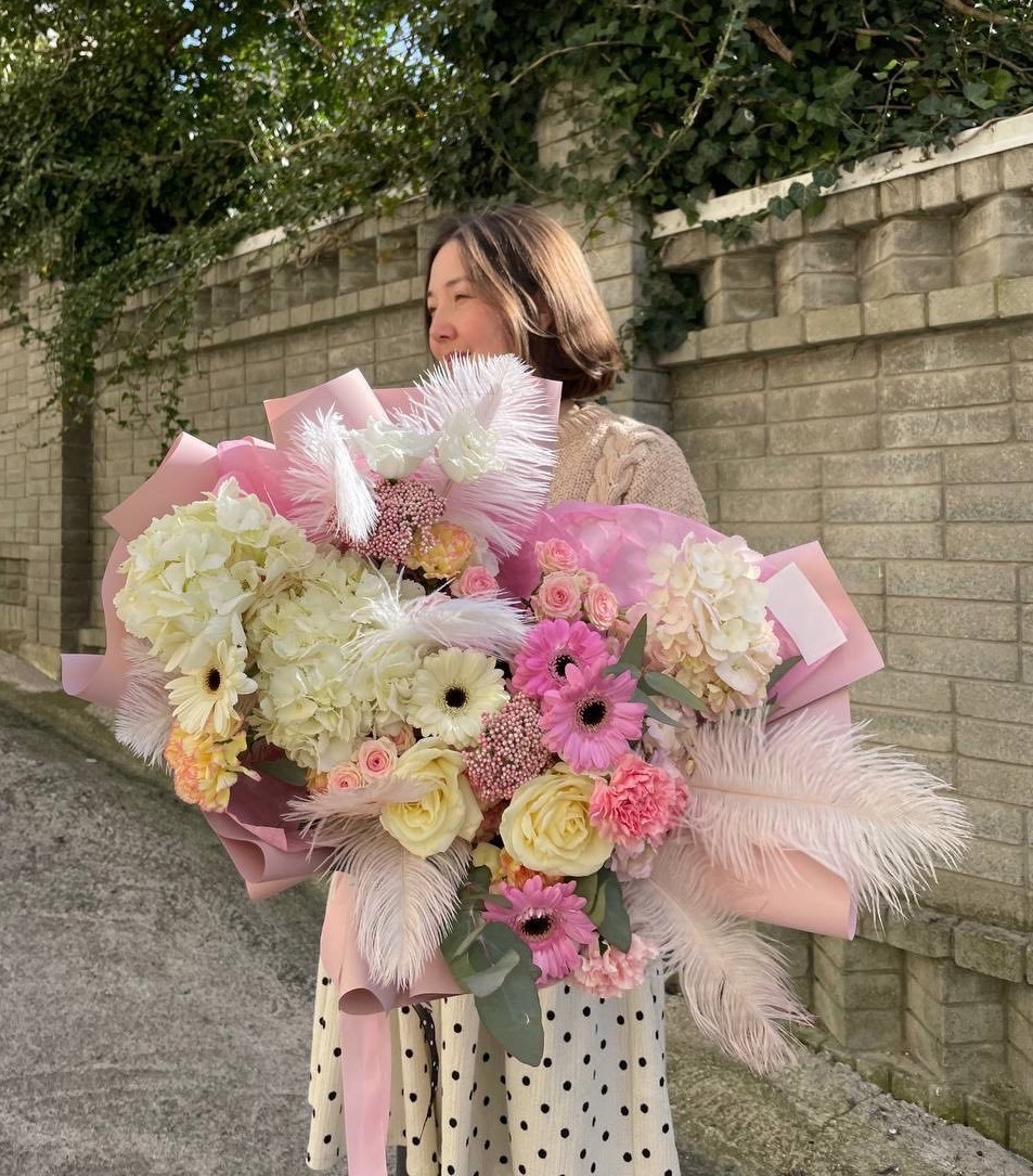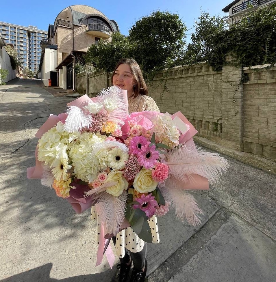 Пышный микс соцветий гортензии, роз и гербер с добавлением перьев и озотамнуса. Авторская композиция объединяет садовую свободу и графичную точность линий.