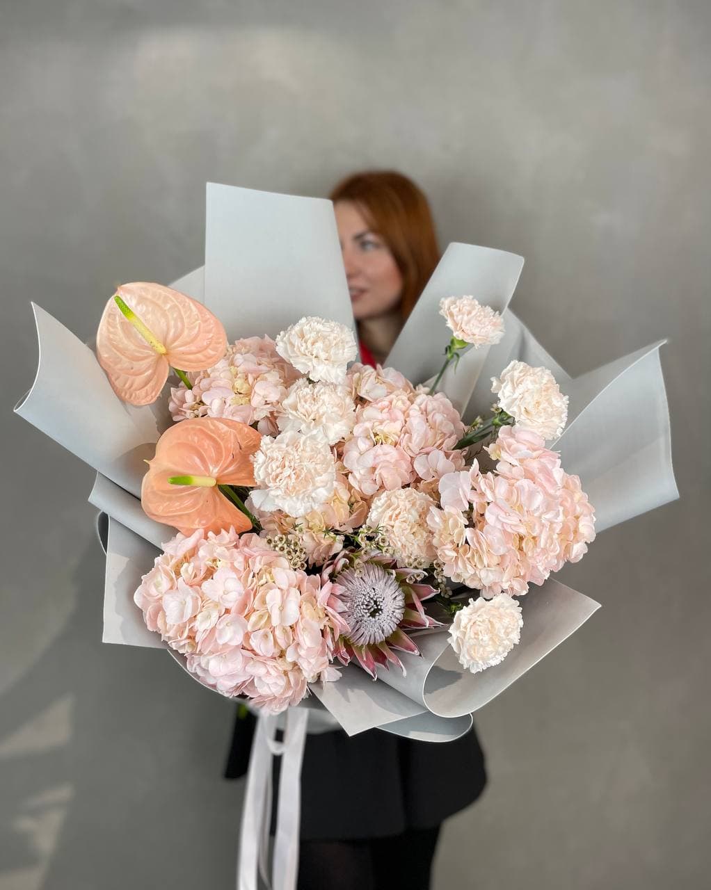 гортензия, протея, хамелациум, диантусы (или эустома), антуриум или лист стрелиции, дизайнерское оформление.