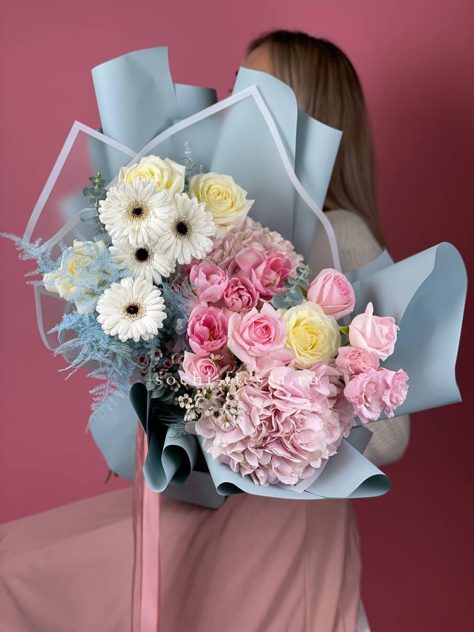 гортензия, белая роза, розовая роза, гербера, эустома, декоративная зелень, эвкалипт дизайнерское оформление, лента.