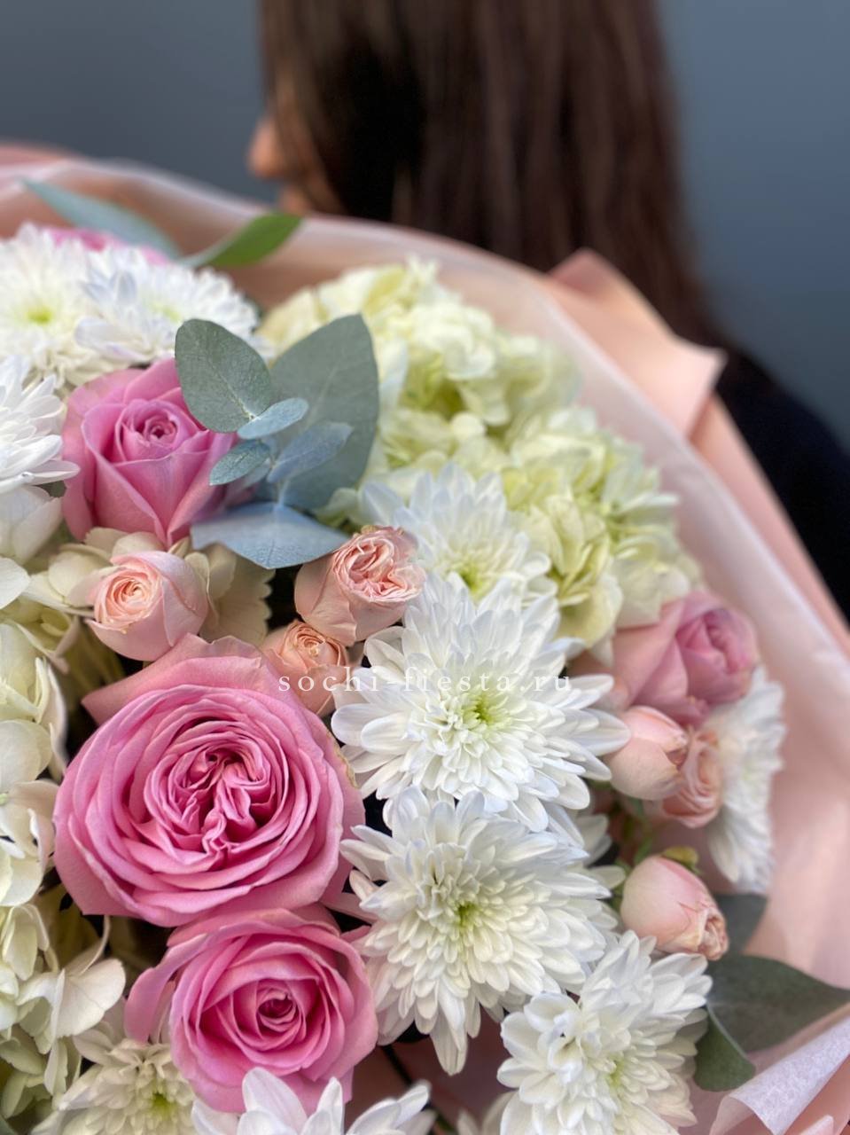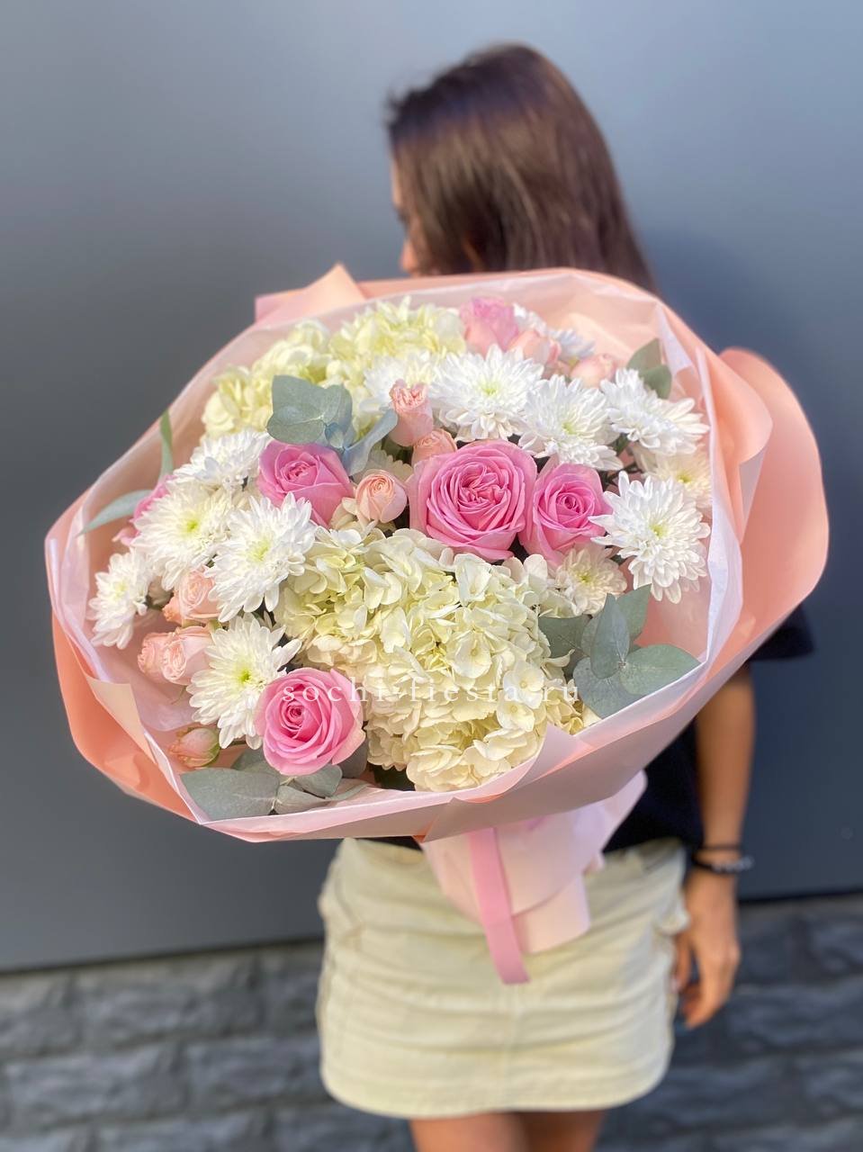 Сочетание вывернутых роз с гортензией, диантусами, розами, бомбастиками создает воздушных элегантный образ идеального цветочного подарка