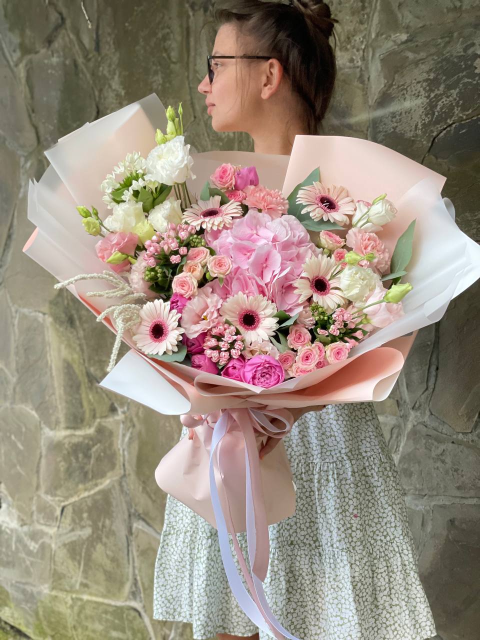 гортензия, диантус, мисти бабблс, астильба или аналог, гербера, кустовая роза, бовардия, эустома, эвкалипт, авторская упаковка, лента.