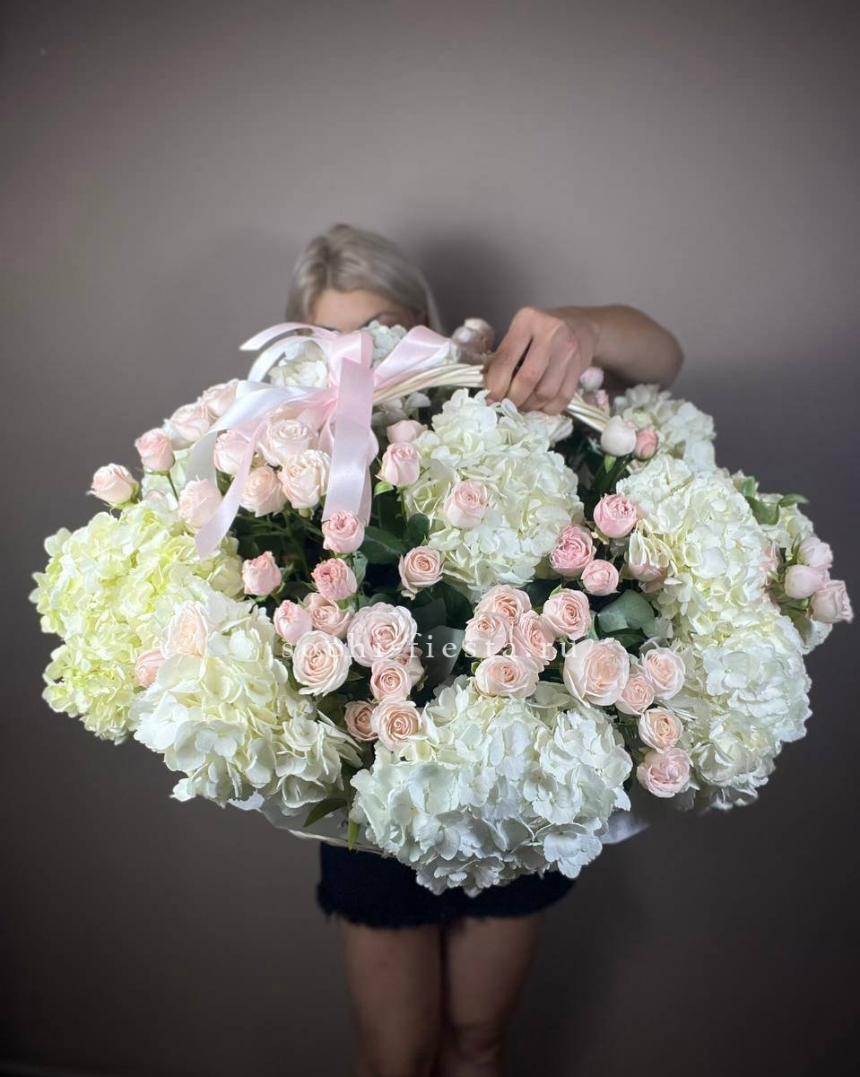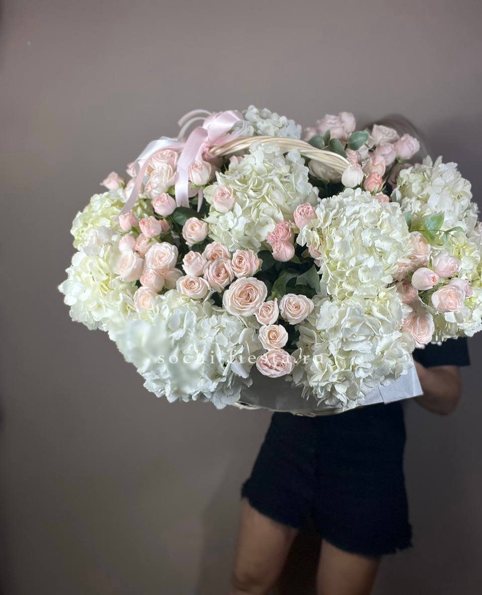 Гортензия и кустовые розы соединяются с веточками эвкалипта и ваксфлауэра в свободной композиции. Разная плотность соцветий создаёт живой ритм и природную лёгкость.