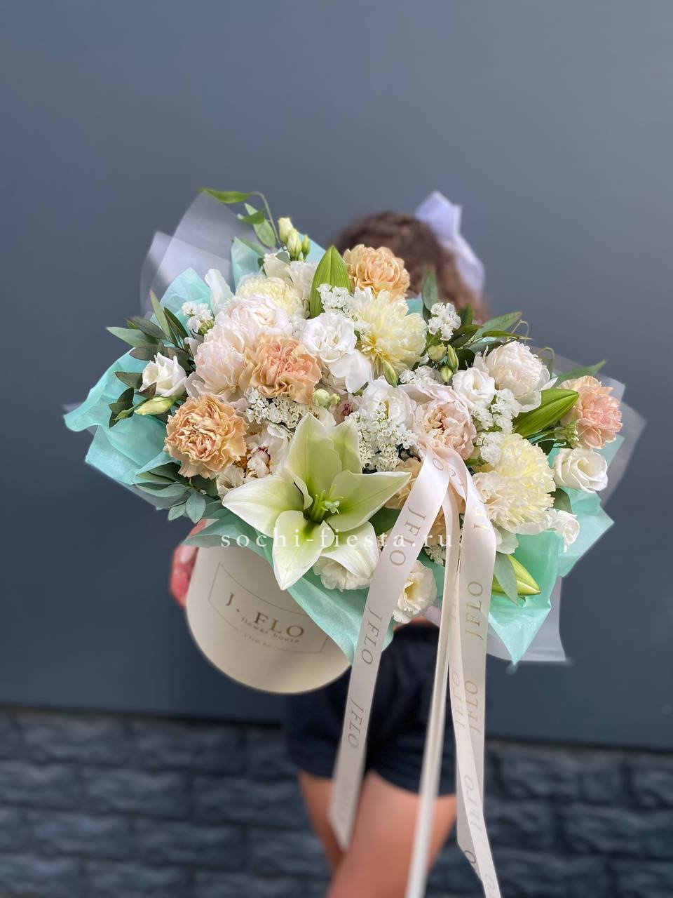 лилии, диантусы, статица, пионы или замена в не сезон эвкалипт, цилиндр.Состав может меняться в зависимости от сезона.
