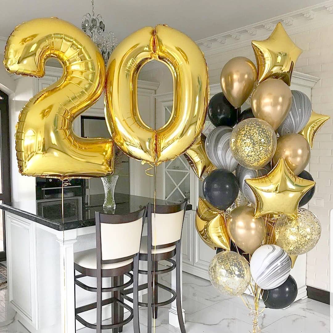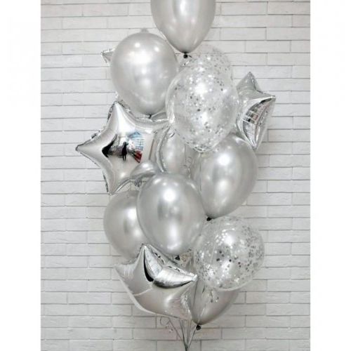 9 гелиевых шаров (конфетти, фольга, латекс), картонный подарочный бокс 70x70. По желанию заказчика может быть использована коробка без надписи.