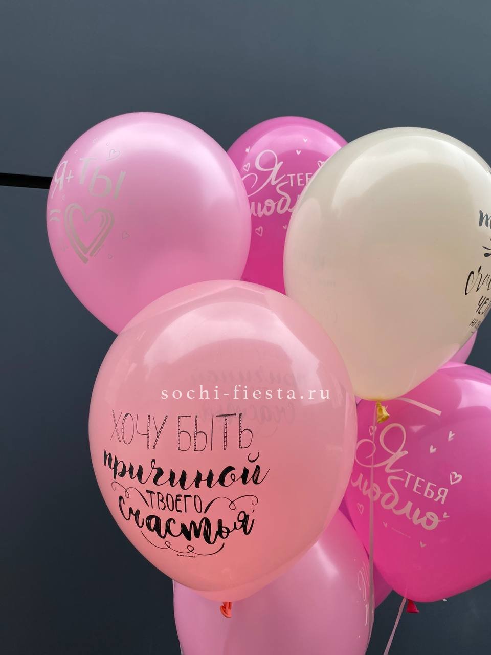 Двенадцать шаров с разными признаниями собраны в лёгкую воздушную группу. Каждая надпись читается отдельно и создаёт личное послание. Простая форма и понятный язык без лишних деталей.