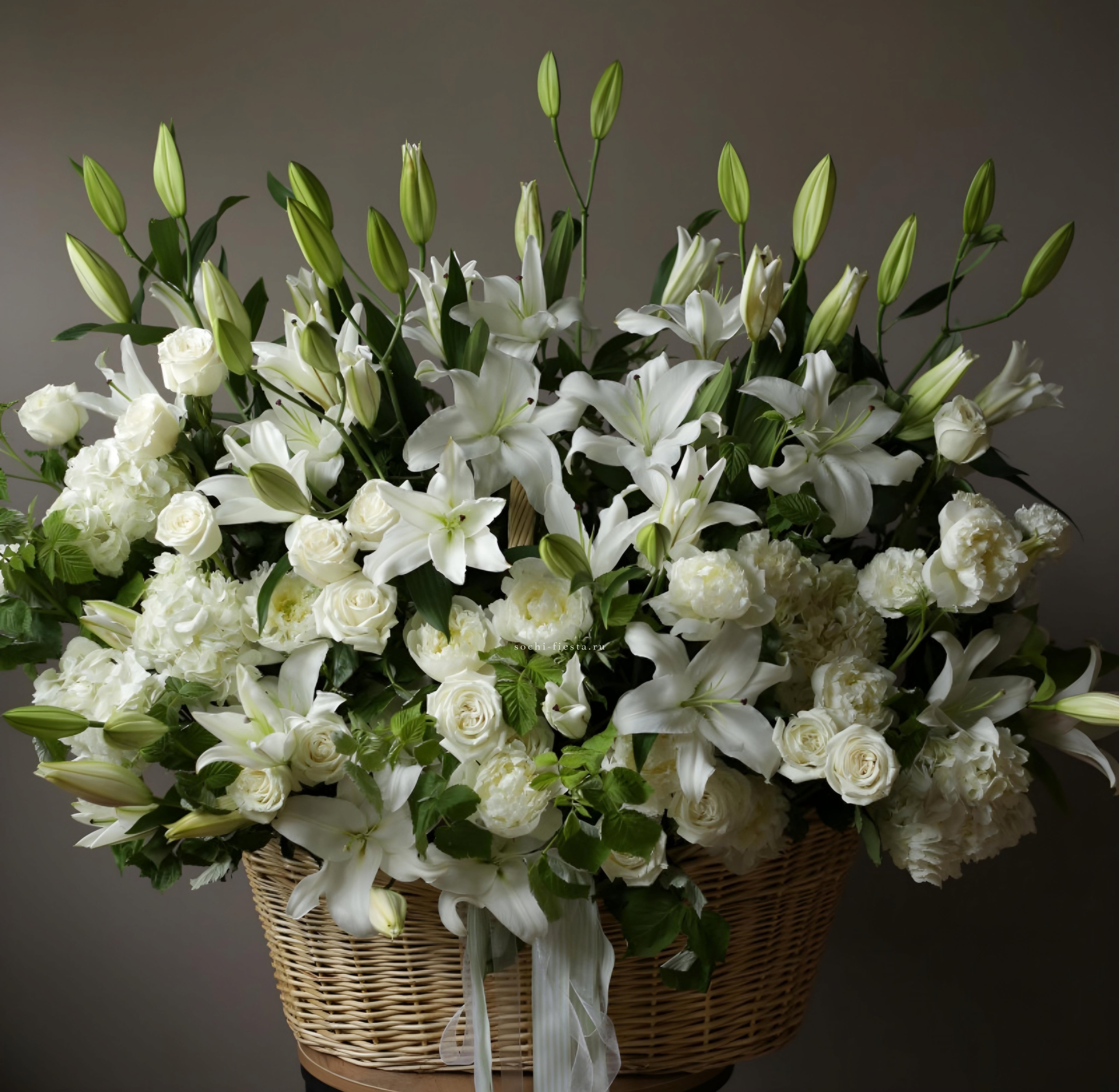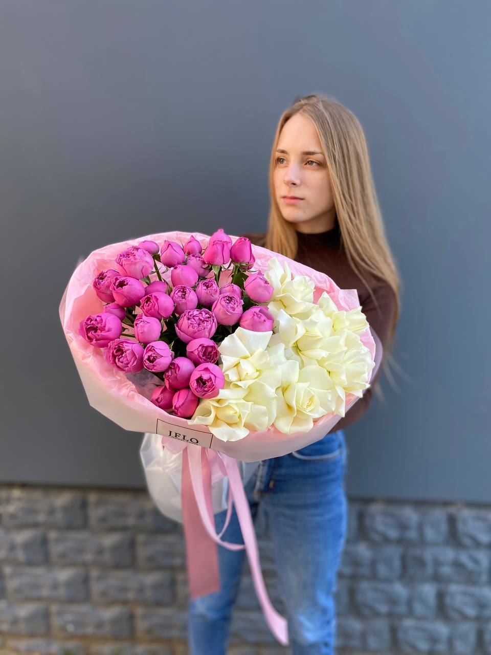 Пионовидные бутоны мисти баблс раскрываются мягкими волнами, создавая объёмную текстуру рядом с классическими белыми розами. Букет построен на игре плотности: пышные головки чередуются с точёными силуэтами, собирая взгляд к центру композиции.