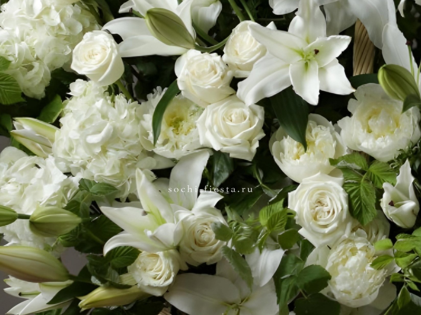 белые и пионовидные розы мисти баблс в нежном оформлении.