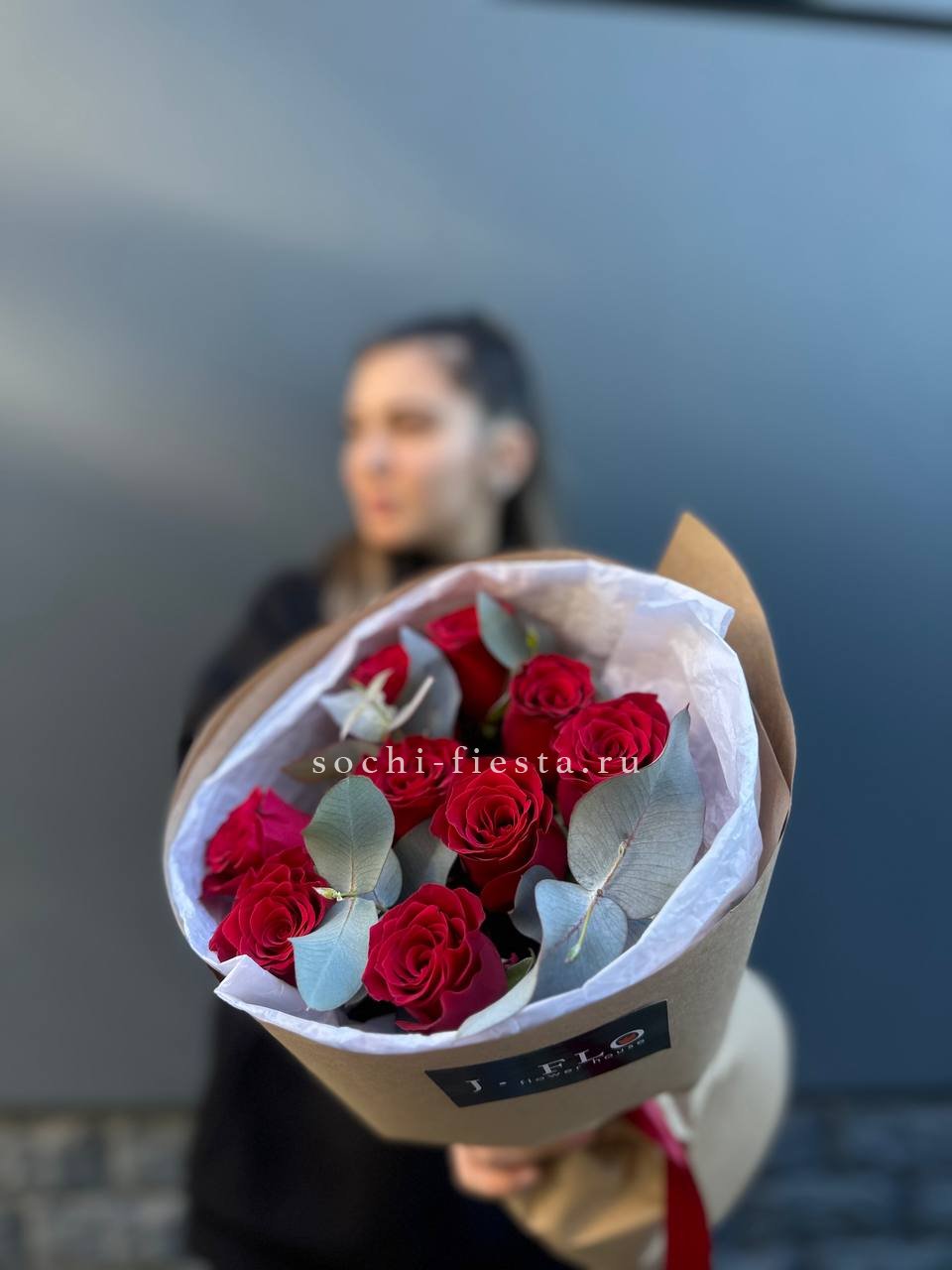 кустовые пионовидные розы Бомбастик, эвкалипт, цилиндр D13, бумага тишью, лента.