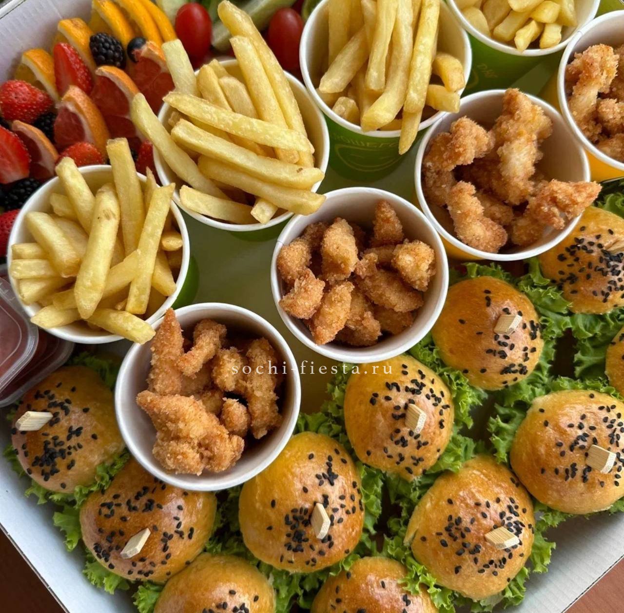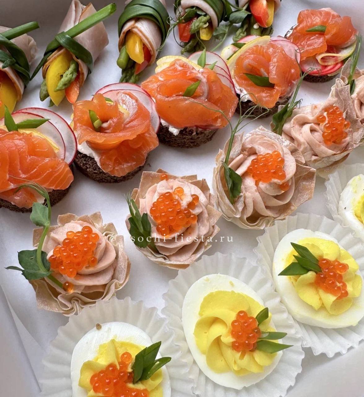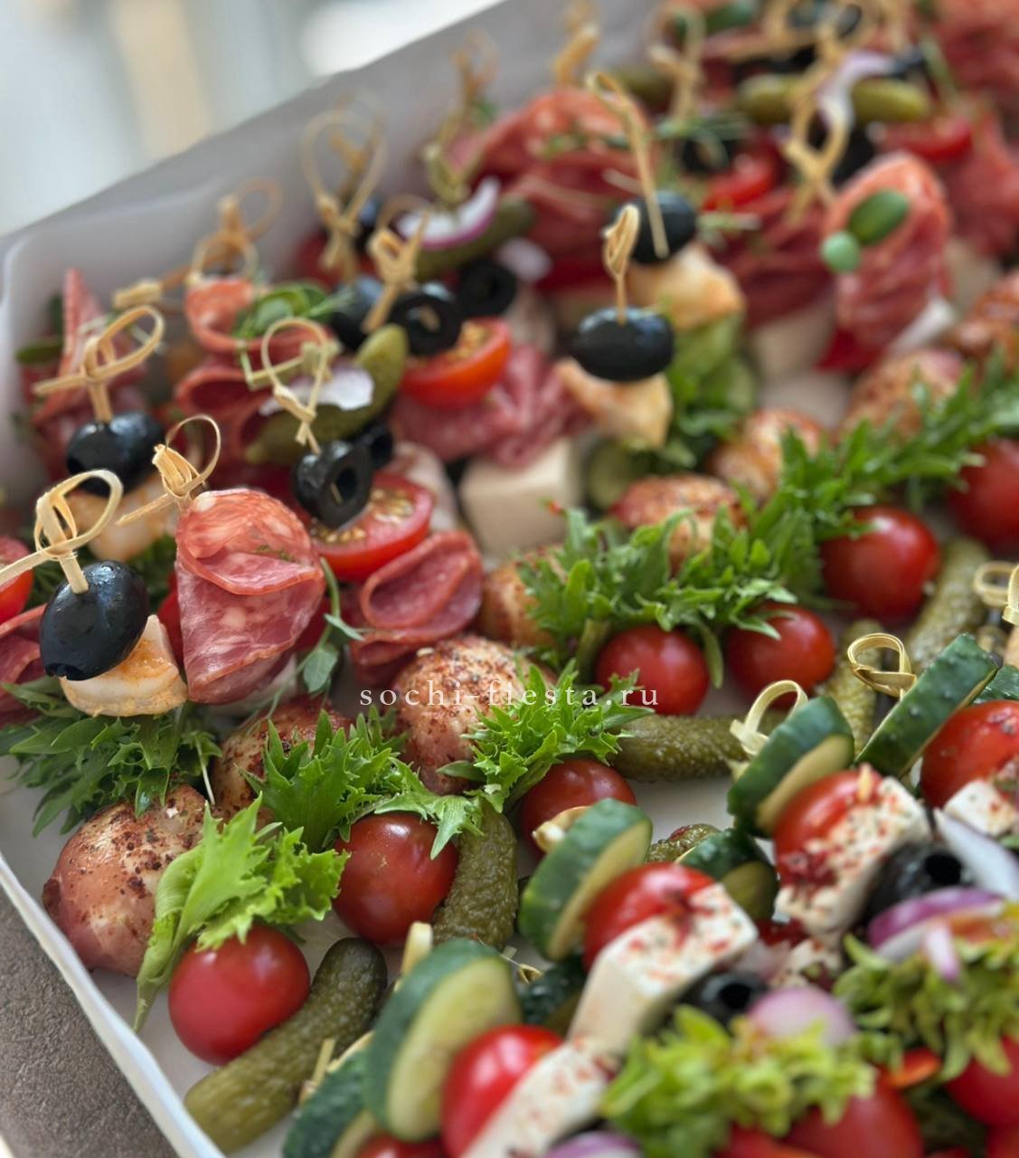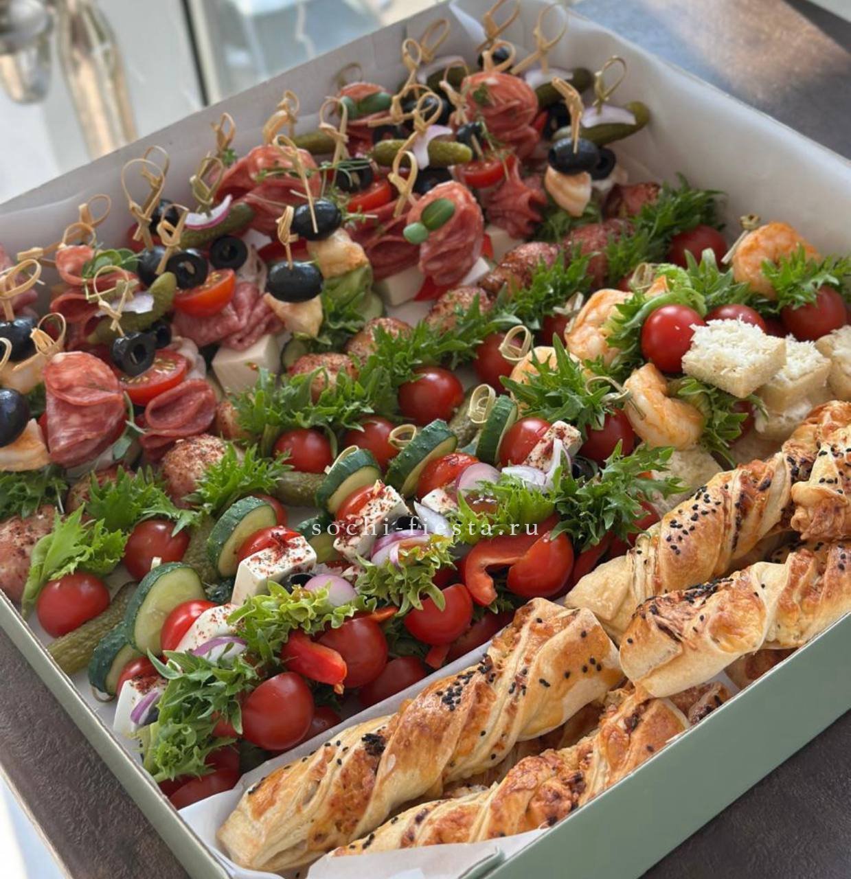 72 закуски. Ассорти мини-канапе закусочных — 32 шт. Картофель бейби в грудинке с корнишоном и черри- 10 шт. Салаты на шпажке: Греческий- 10шт. Цезарь с креветками— 10шт. Закуска к пиву хрустящая из слоеного теста с сыром и специями- 10шт.