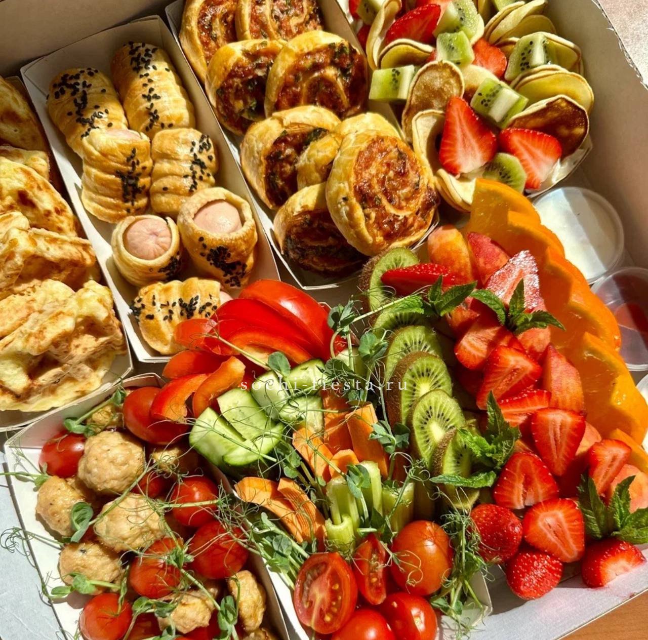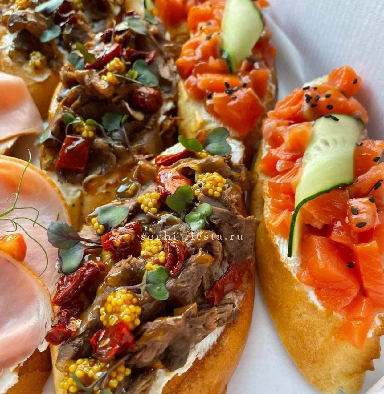 с говядиной и вялеными помидорами- 4 шт. С нежным сливочным паштетом из куриной печени- 4 шт.С семгой и огурцом на крем чиз- 4 шт. С карбонадом, черри и салатом- 4 шт.