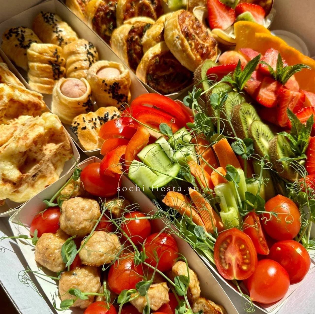 Шестнадцать брускетт с мясными и рыбными начинками. Говядина с вялеными томатами, паштет из печени, семга с огурцом и карбонад с черри раскрывают богатство вкусов в одной подаче.