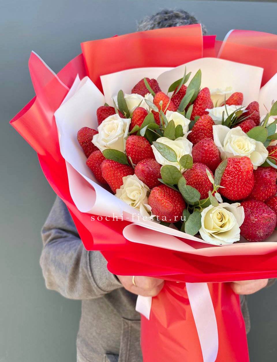 300-400г. ароматной клубники, кустовая роза, эвкалипт, лента, дизайнерская бумага.