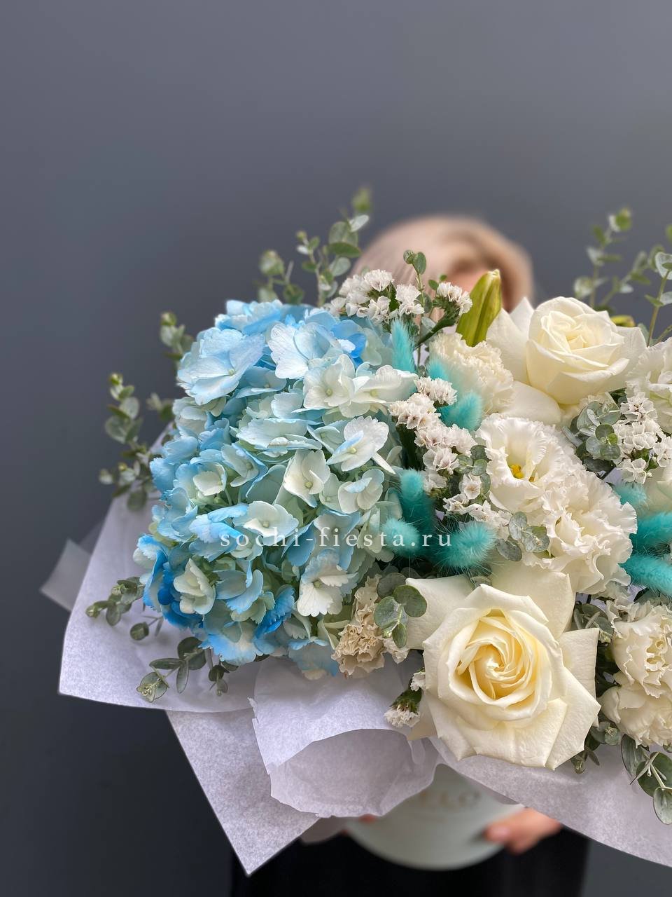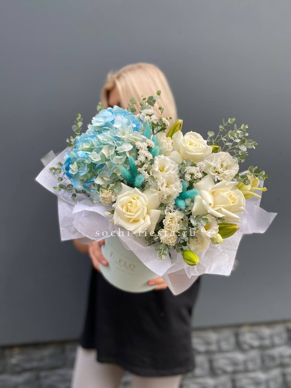 Голубая гортензия задает спокойный тон всей композиции, где статица и лагурус добавляют воздушности. Розы и лилии дополняют образ свежими акцентами без лишней пышности.