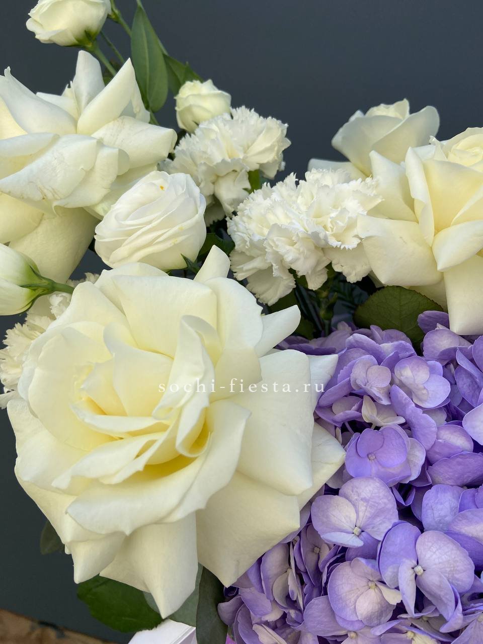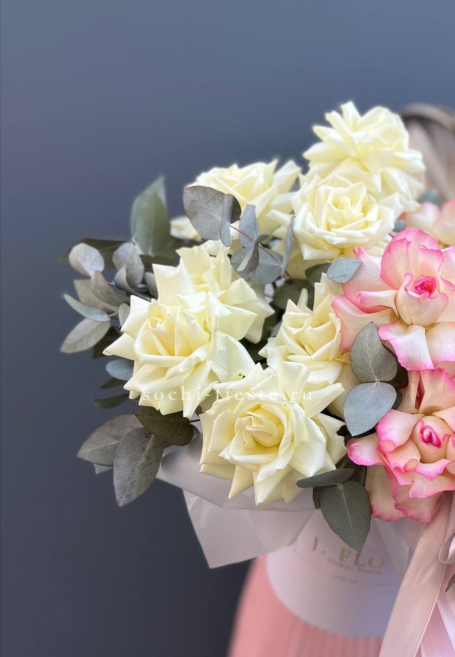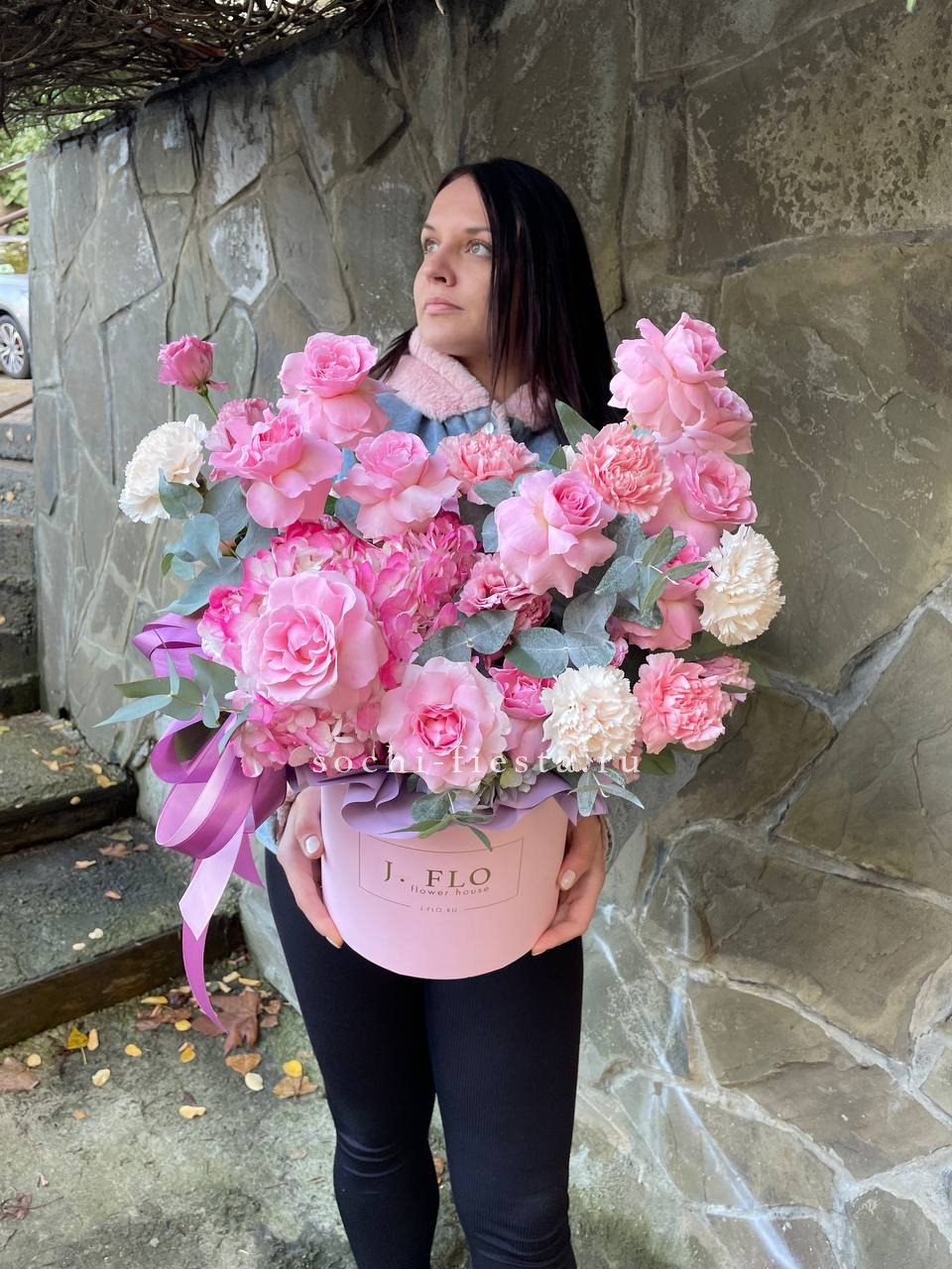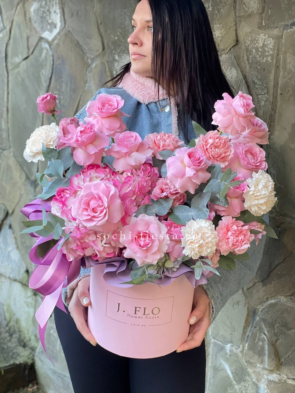 Эустомы и пионовидные розы соседствуют с французскими макарон в коробке в форме сердца. Диантусы и эвкалипт создают объём, а сладкий акцент делает композицию завершённой.