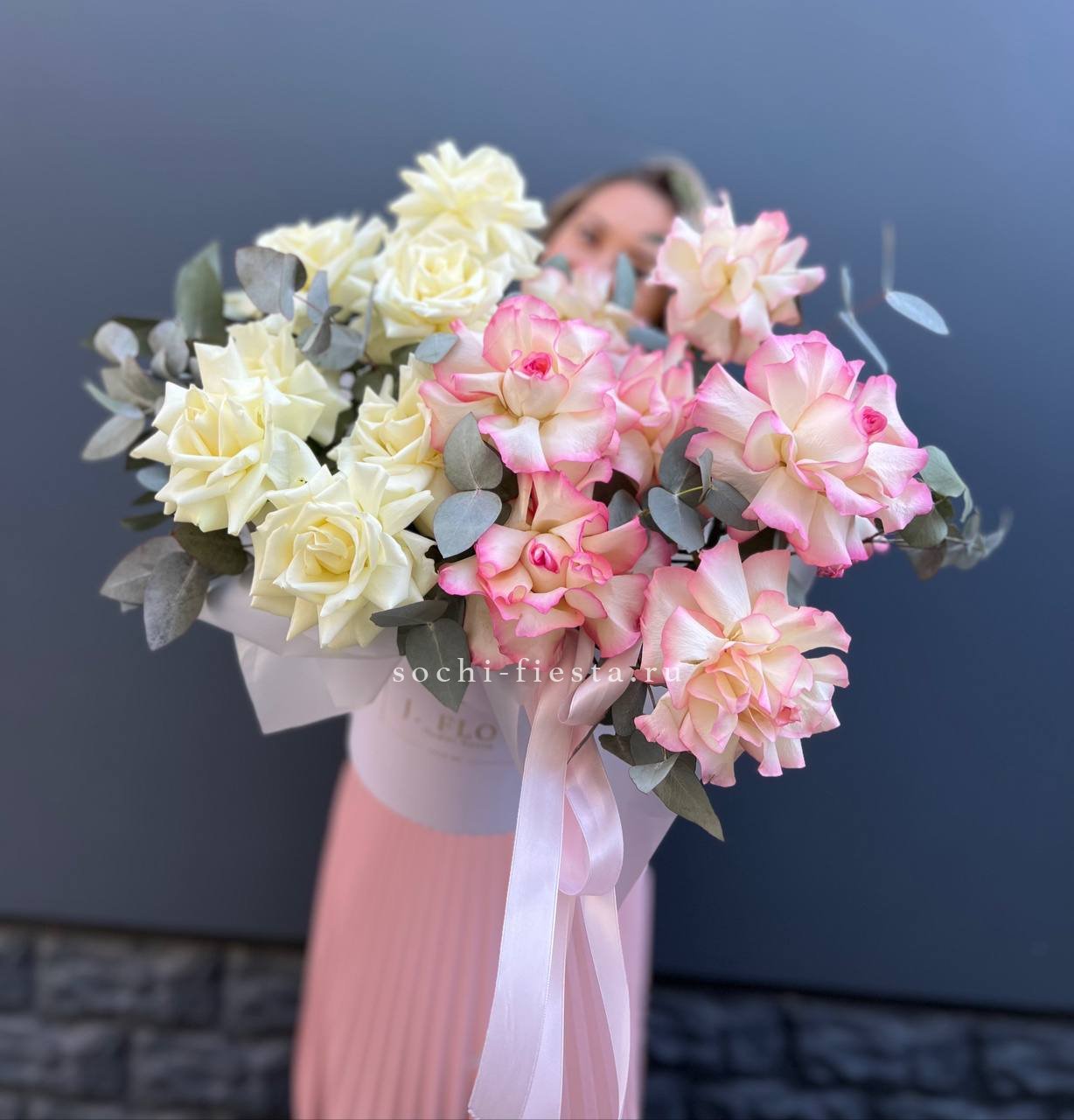 эустома, пионовидные розы, диантусы, печенье макаронс, эвкалипт, коробка-сердце.