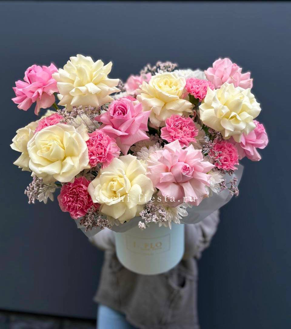 гортензия, эустома, диантусы, розы, эвкалипт и прочие цветы, гармонирующие по фактуре. Цветочная композиция в белых, нежно-сиреневых, розовых тонах в квадратном боксе D25.
