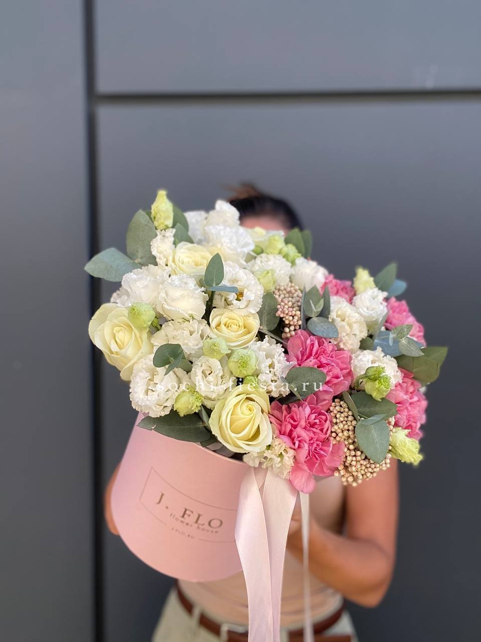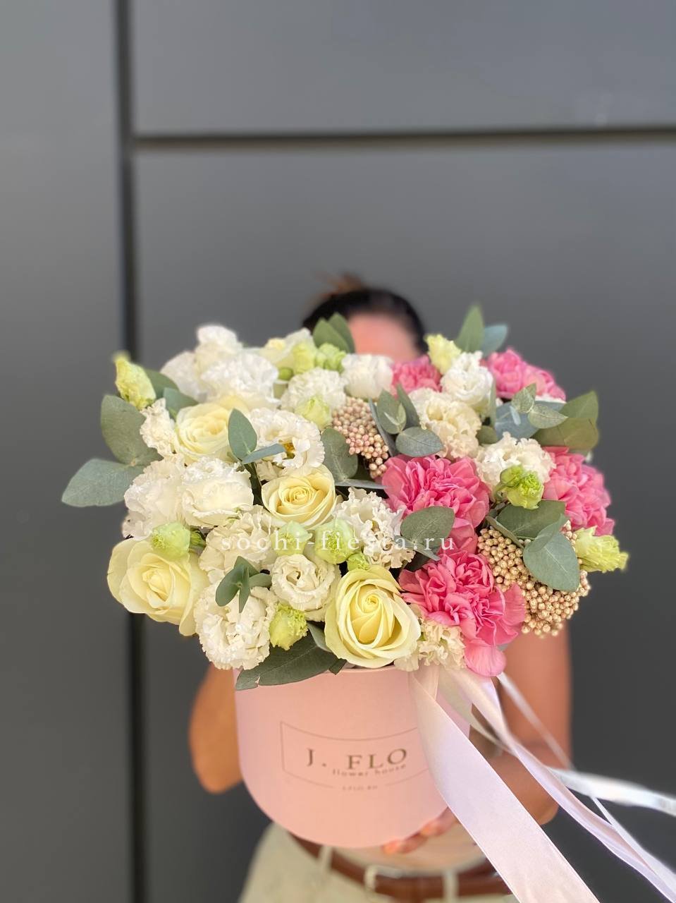 Пионовидные розы раскрываются пышными шапками среди воздушной гортензии и эустомы. Композиция собрана в круглом боксе и держит форму без дополнительной упаковки.