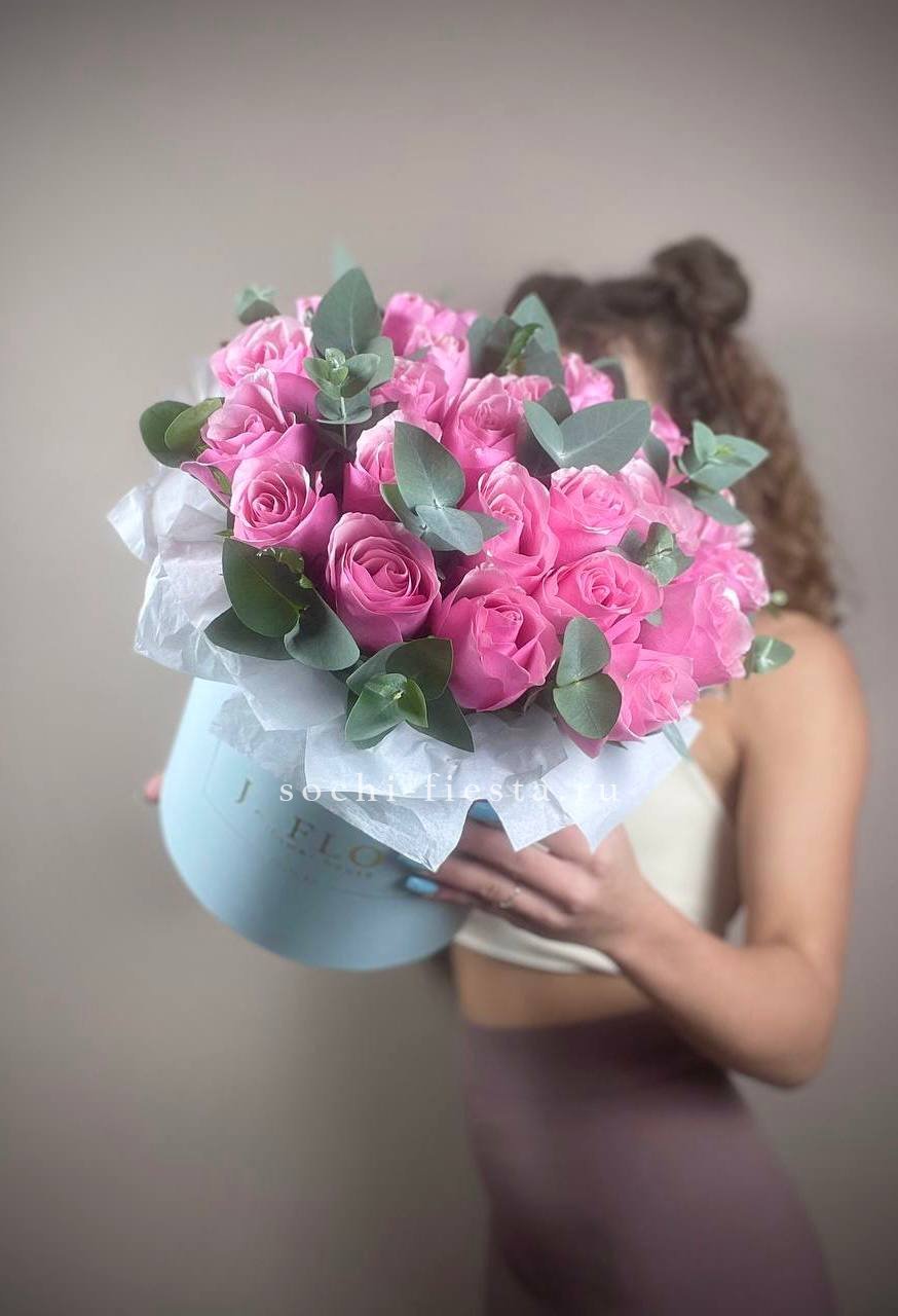 27 розовых роз в шляпной коробке с эвкалиптом.