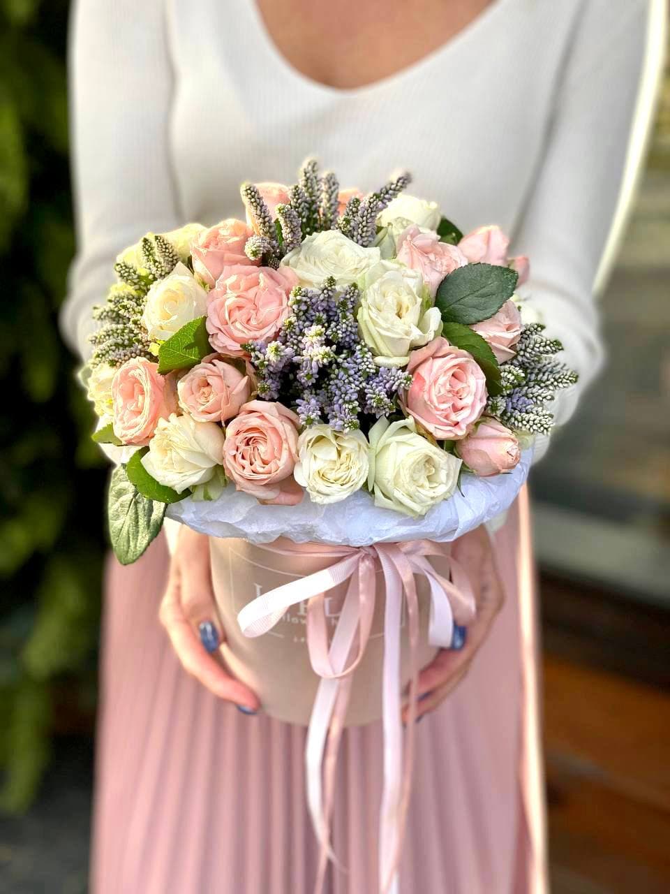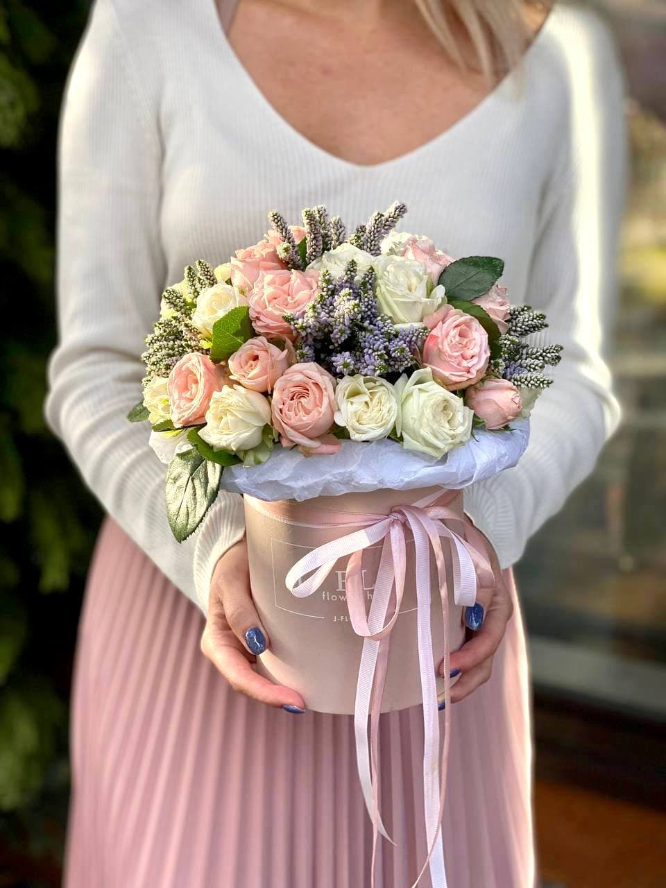 Воздушная композиция в пастельной гамме с акцентом на фактуру раскрытых бутонов. Пионовидные розы и эустома создают объёмный силуэт, а хлопок добавляет графичности.