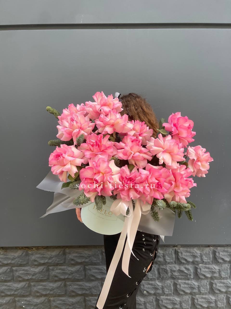 Пятнадцать роз Мандала в боксе образуют плотную шапку с густыми многослойными бутонами. Нобилис добавляет фактурную глубину и завершает композицию.