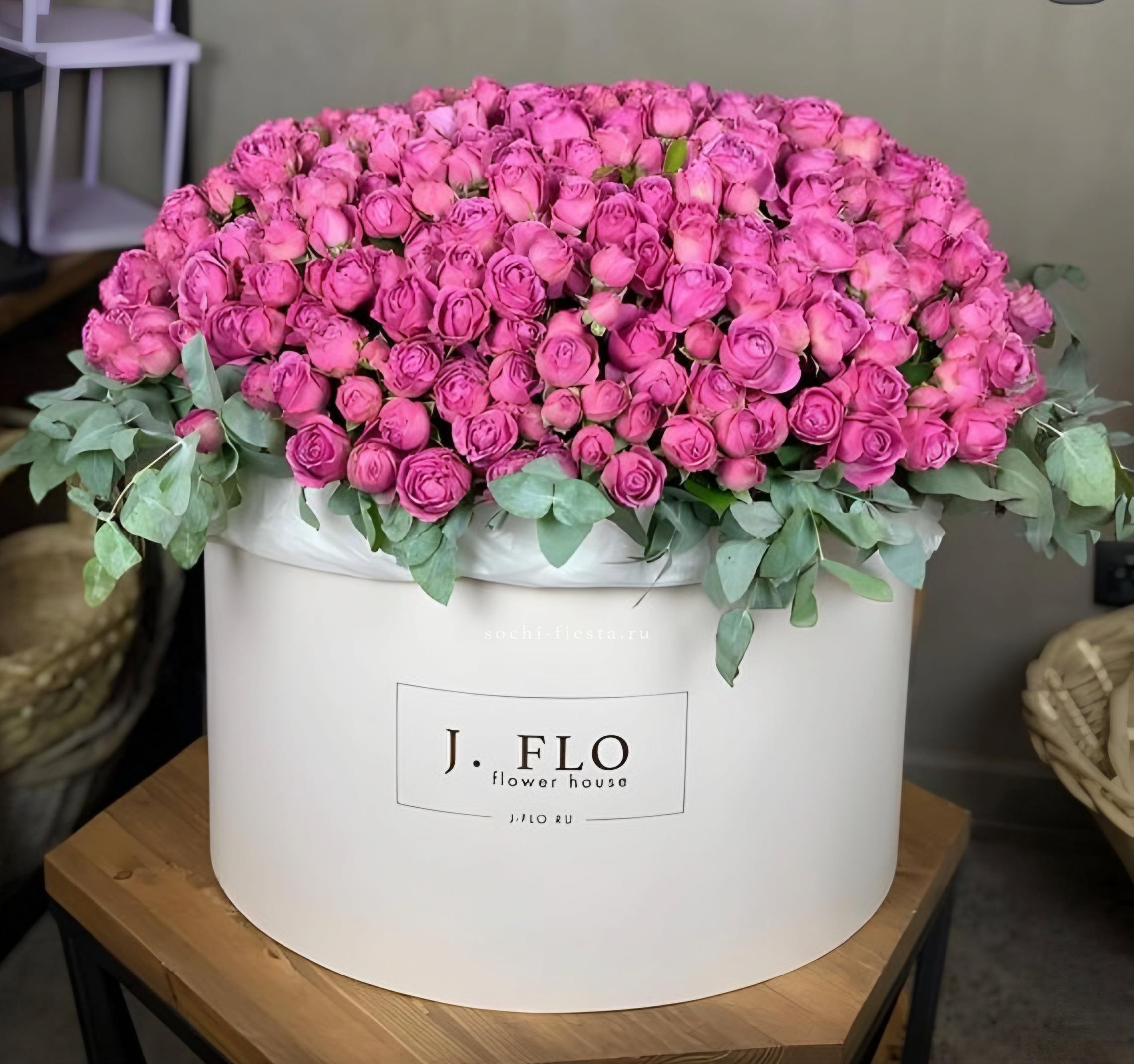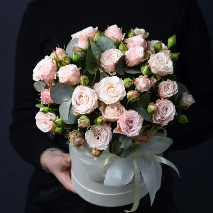 пионовидная роза сорта Мисти бабблс, эвкалипт в коробке или корзине.