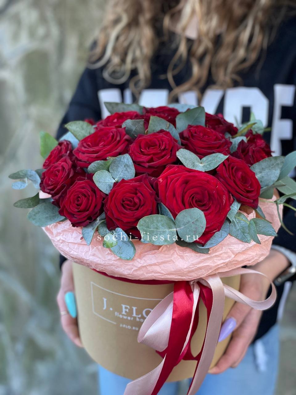 Букет выполнен в насыщенной красно-розовой гамме, создавая контрастное и выразительное сочетание, которое может символизировать сильные чувства или страсть. Это современный авторский букет, который выглядит роскошно и эффектно, подходящий для особых случаев и подарков.